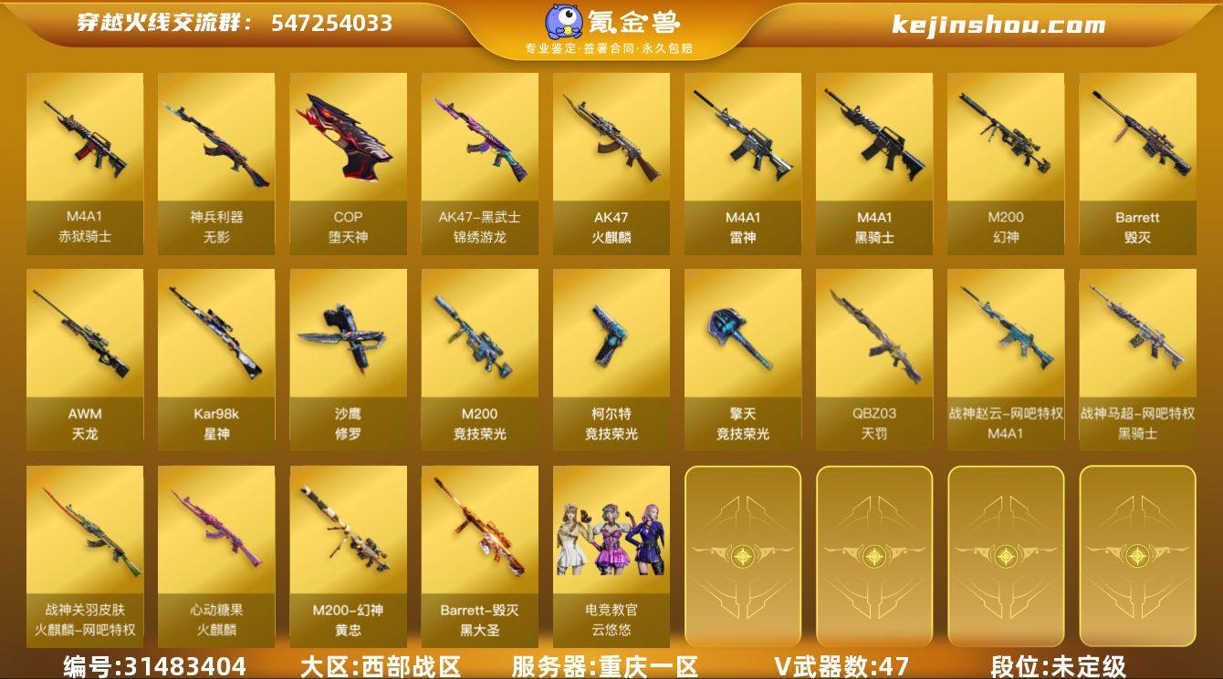 西部47V小极品爆破号/竞技荣光套/4防云悠悠/幻神/幻神黄忠/98K星神/M200竞技荣光/柯尔特竞技荣光/COP堕天神/QBZ天罚/毁灭黑大圣带紫橙光效/雷神战神赵云/黑骑士战神马超/火麒麟战神关羽/裁决雪莉杨/天龙/无影神兵利器/3把擎天竞技荣光/7套以上V雷/cf1072