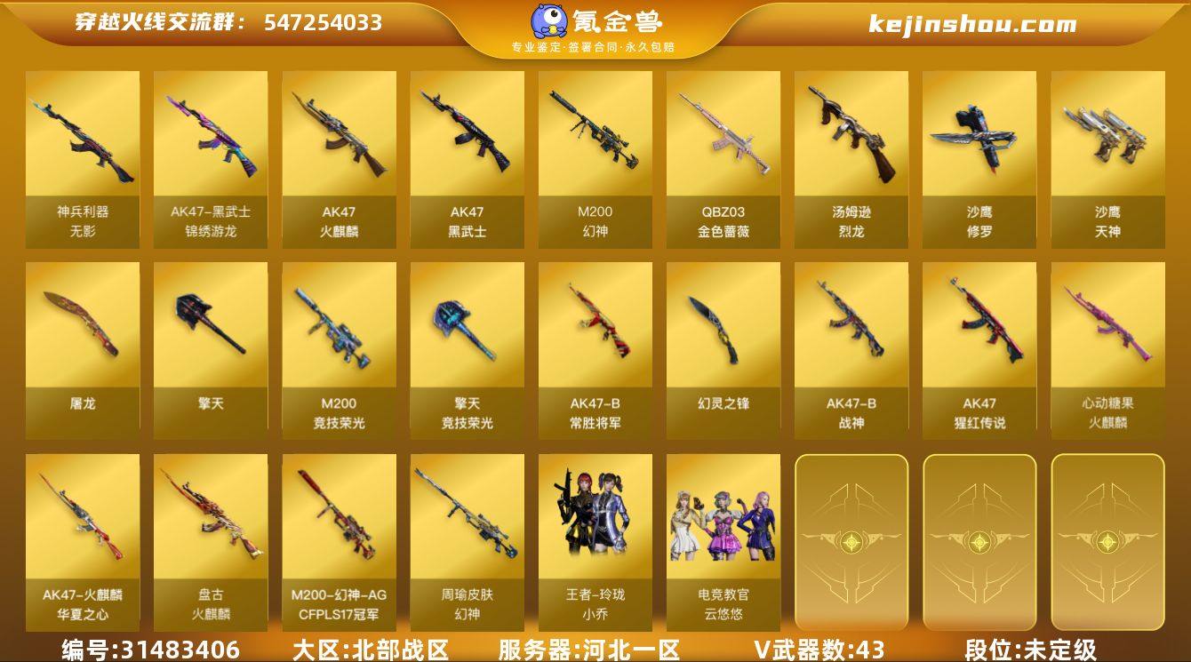 北部43V极品爆破号/幻神双皮三件套/4防王者玲珑小乔/3防云悠悠/幻神/幻神AG/幻神周瑜/幻神音效卡/M200竞技荣光/觉醒王者白虎/觉醒王者蔷薇/觉醒王者冰魄/火麒麟盘古/QBZ金色蔷薇/无影神兵利器/黑武士/烈龙/修罗CFS/天神/2王者之击/幻灵之锋/擎天竞技荣光/屠龙/永久超级护目镜/cf1074