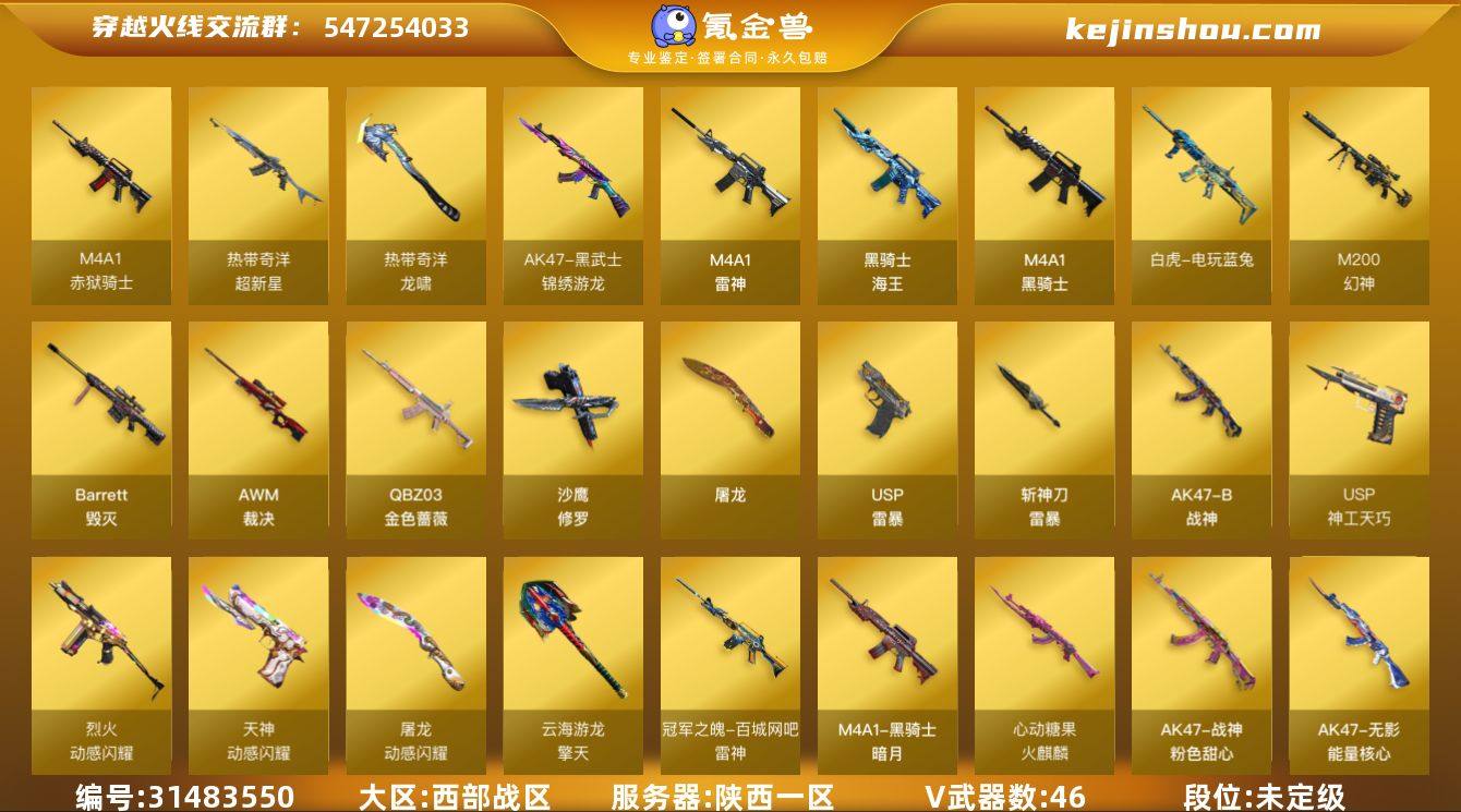 陕西一区-46V-1王者-0炫金 【热门武器】:QBZ03-金色蔷薇,M200-幻神,白虎-电玩蓝兔,M4A1-黑骑士,斯泰尔-蝴蝶,COP-白鲨*2,USP-雷暴,沙鹰-修罗*3 【音效卡】:AN94-超新星-热带奇洋音效卡,M200-幻神音效卡,Barrett-碧霄极光音效卡 【皮肤】:幻神-宠儿-2021MVP,雷神-冠军之魄,火麒麟-雷神,火麒麟-心动糖果,毁灭-冠军之怒,黑骑士-暗月,无影-能量核心,战神-粉色甜心皮肤*2 【角色】:奇洋探员,乔伊教练,修道士,云海玲珑,暗夜-X,电竞少女,飞虎队-X,风暴女,嘉年华灵狐,灵狐者-X,潘多拉-X,斯沃特-X,游珑儿,职业选手 【人偶武器】:COP-白鲨*2,斯泰尔-蝴蝶,AWM-灵狐-15周年嘉年华*2,迷你深渊冰龙,迷你牛魔王,迷你波特博士,夺魂,深渊终结者手雷,迷你艾比,迷你超能女侍,迷你巨石泰坦-魔花研究所 【挑战大师】:神圣爆裂者III,激光毁灭者III-白马银枪,神圣爆裂者-末日III 【英雄级武器】:M4A1-雷神*2,M4A1-黑骑士,黑武士-锦绣游龙,超新星-热带奇洋,QBZ03-金色蔷薇,烈火-动感闪耀,AK47-B-战神,黑骑士-海王,白虎-电玩蓝兔,Barrett-毁灭*2,AWM-裁决,M200-幻神,王者之力-觉醒版,沙鹰-修罗*3,USP-雷暴,USP-神工天巧,天神-动感闪耀,屠龙,屠龙-动感闪耀,擎天-云海游龙,龙啸-热带奇洋,斩神刀-雷暴,高爆手雷-雷暴*4,高爆手雷-神工天巧,手雷-动感闪耀,手雷-云海游龙,手雷-热带奇洋,闪光弹-雷暴*5,烟雾弹-雷暴*5,烟雾弹-神工天巧,M4A1-赤狱骑士,M4A1-苍鸣雷神,Barrett-碧霄极光 【道具】:BS战队炫彩背包,云山科技背包,亚洲杯纪念炫彩背包,全能枪王背包,奇洋探员-海龟背包,炫彩背包,热带奇洋炫彩背包,背包-洛丽塔,虎牙炫彩背包,超级背包,哔哩哔哩名片,女皇终结者-魔龙之吻,救世主-黑桃战神,黄金生化钩,绿色巨人,灵魂忍者*2,变异宝贝,迷雾幽...