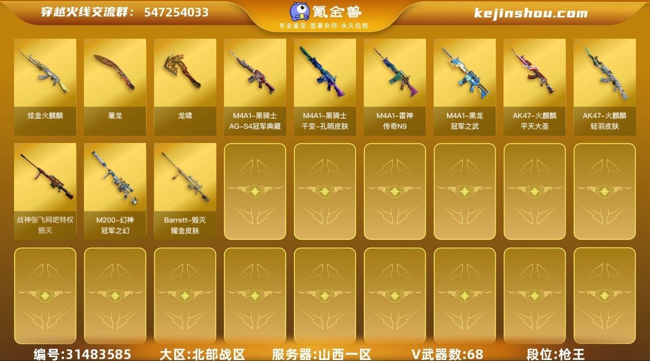 【FC-naP665】【四防艾莉莎/四防华/四防王者影豹/幻神+白鲨+宠儿+冠军之幻/星神+AG/星霆/白虎三件套/金色蔷薇+白鲨+巅峰/幻灵套cop*3/usp雷暴/usp神工天巧*3/cop云龙/世冠柯尔特/炽芒蝶刃/冠军之刃/极光带卡/雷神三件套/黑骑士三件套/裁决+羽掣/cop白鲨/斯泰尔蝴蝶】 山西一区,等级100,王者武器4,炫金武器1,V武器68, 【英雄角色】传说艾莉莎,王者影豹,华,职业选手,雷霆-α,猎狐者, 【V武器】M200-幻神,Kar98K-星神,Barrett-毁灭,AWM-裁决,Scar Light-白虎,QBZ03-金色蔷薇,M4A1-幻灵,加特林-炼狱,USP-雷暴,USP-神工天巧,COP 357-云龙,COP 357-幻灵,Knife-冠军之刃,炽芒蝶刃,Barrett-极光,M4A1-雷神,M4A1-黑骑士,AK47-火麒麟,AK47-黑武士,无影-神兵利器,黑武士-锦绣游龙,沙鹰-修罗,屠龙,麒麟刺,龙啸,擎天,幻灵之锋,斩神刀-雷暴,唐刀-古蛇迷踪,龙啸-烈火龙威,高爆手雷-雷暴,闪光弹-雷暴,烟雾弹-雷暴,高爆手雷-幻灵,闪光弹-幻灵,烟雾弹-幻灵,高爆手雷-竞技荣光,高爆手雷-神工天巧,闪光弹-神工天巧,高爆手雷-云龙,烟雾弹-神工天巧,闪光弹-云龙,烟雾弹-云龙,高爆手雷-古蛇迷踪,烟雾弹-古蛇迷踪,高爆手雷-雷霆王者, 【王者武器】王者之势-觉醒版,王者星霆,高爆手雷-雷霆王者, 【狙击枪稀有皮肤】幻神-冠军之幻,幻神-宠儿-2021MVP,M200-幻神-荣耀世冠白鲨,毁灭耀金皮肤,毁灭-战神张飞,毁灭-黑大圣皮肤,巴雷特-毁灭-CFPL冠军, 【步枪稀有皮肤】白虎-虎啸皮肤,M4A1-雷神-巅峰荣耀皮肤,雷神-R.LGD-CFPLS18冠军,雷神-传奇N9,火麒麟-CFSTAR,火麒麟-心动糖果,火麒麟-轻羽皮肤,火麒麟-平天大圣,火麒麟-巅峰荣耀,火麒麟-QQ会员,火麒麟-百城,黑骑士-AG-S4冠军典藏,M4A1-千变-孔明皮肤,黑龙-冠军之武,QBZ03-荣耀世冠白鲨,QBZ03-巅峰荣