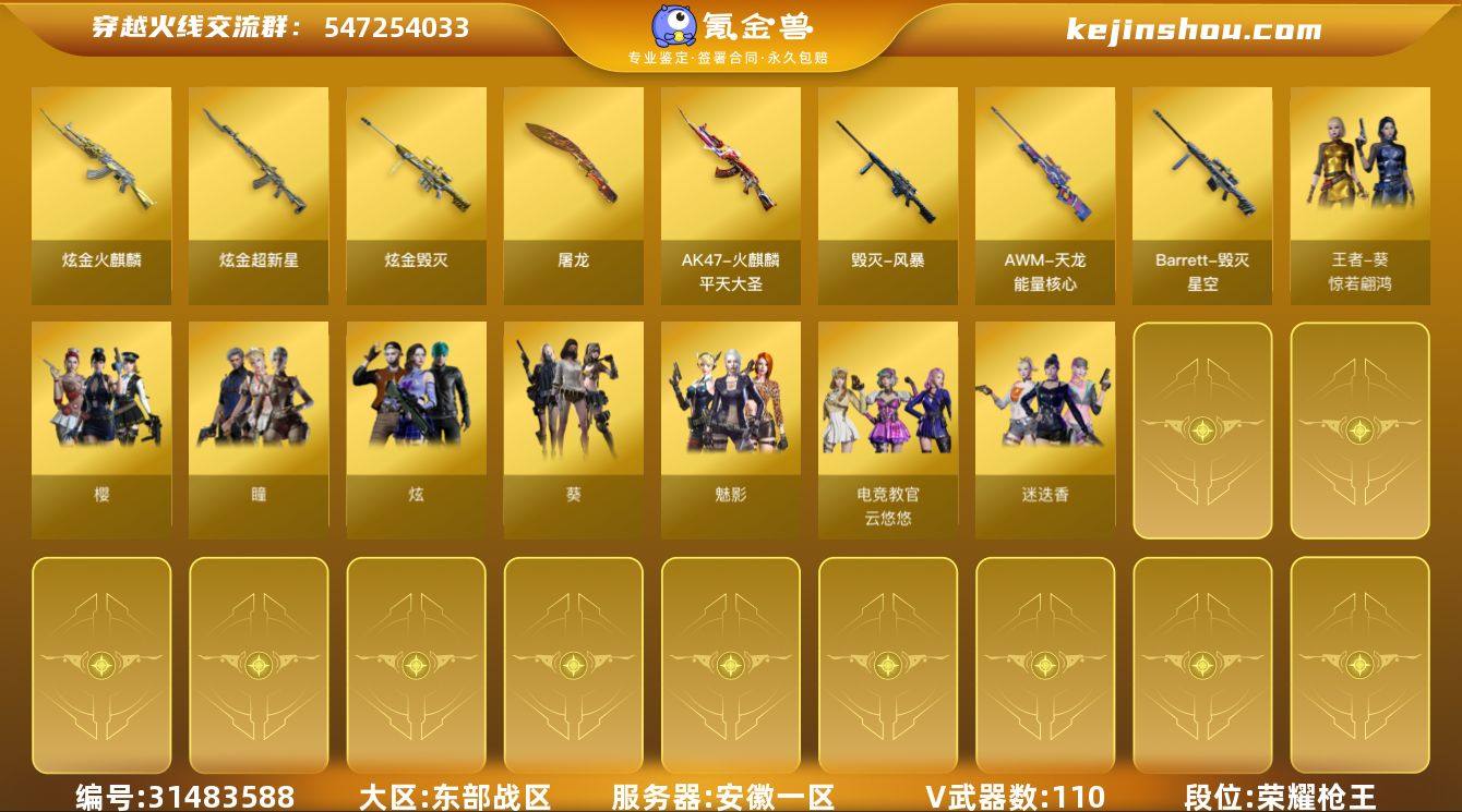 【FC-AitB5g】【附赠安卓王者号/四防云悠悠/四防王者葵/四防王者潘多拉/3个四防扩展卷/传说辉光/幻神+曹操/竞技荣光套/王者幻神/6盘+小刚/6烈3炼狱+炎龙+枪娘暗刃/白虎/金色蔷薇/夜魔套/cop堕天神*2/usp雷暴/cop雷霆/毁灭三件套/火麒麟三件套/朱雀/王者冰魄/王者之决/白鲨手套】安徽一区,等级100,传说武器1,王者武器10,炫金武器5,V武器110, 【英雄角色】王者潘多拉,魅影,迷迭香,樱,电竞教官-云悠悠,葵,瞳,炫,职业选手,炽天使,灵动武士,灵狐者-黄金海岸,雷霆-α,猎狐者,王者葵-惊若翩鸿, 【传说武器】传说辉光, 【V武器】M200-幻神,M200-竞技荣光,Barrett-毁灭,Scar Light-白虎,QBZ03-金色蔷薇,M4A1-夜魔,RPK-盘龙,加特林-炼狱,炼狱-风暴,汤姆逊-烈龙,柯尔特-竞技荣光,USP-雷暴,COP-堕天神,破空枪刃-夜魔,雷霆之契,Barrett-极光,AWM-天龙,HK417-朱雀,M4A1-雷神,M4A1-黑骑士,M4A1-龙血,AK47-火麒麟,AK47-无影,AK47-黑武士,AK47-机械迷城,AN94-超新星,AK12-天启,黑武士-CF网剧冠军,无影-神兵利器,黑武士-锦绣游龙,沙鹰-修罗,沙鹰-天神,天神-CF网剧冠军,屠龙,麒麟刺,龙啸,擎天,擎天-竞技荣光,马来剑-夜魔,雷霆之锋,擎天-CF网剧冠军,高爆手雷-夜魔,闪光弹-夜魔,烟雾弹-夜魔,高爆手雷-竞技荣光,闪光弹-竞技荣光,烟雾弹-竞技荣光,高爆手雷-雷霆,闪光弹-雷霆,烟雾弹-雷霆, 【王者武器】王者幻神-觉醒版,王者之决-觉醒版,王者之烈-觉醒版,王者之心-觉醒版,王者之势-觉醒版,王者凛烈,王者之戮-觉醒版,王者冰魄-觉醒版,悦蓝-惊涛骇浪-觉醒版, 【狙击枪稀有皮肤】毁灭-星空,毁灭-魔灵皮肤,毁灭-风暴,天龙-能量核心, 【步枪稀有皮肤】雷神-耀金皮肤,火麒麟-CFSTAR,火麒麟-白虎,火麒麟-心动糖果,火麒麟-平天大圣,火麒麟-枪娘凯特琳,...