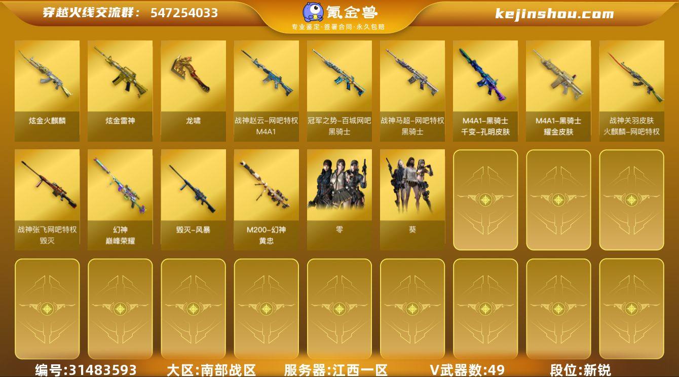 【FC-H4NT6t】生化四防王者沙漠玫瑰/传说暗裔/传说圣灵/传说辉光/幻神+音效卡+巅峰+黄忠/王者星神觉醒版/USP雷暴/炽芒蝶刃/6盘2炼狱/6烈+蝴蝶/白虎+音效卡+电玩粉兔/QBZ+音效卡/竞技套/炽芒蝶刃/黑骑士+音效卡+冠军之势+战神马超+耀金/ 江西一区,等级100,传说武器3,王者武器5,炫金武器5,V武器49, 【英雄角色】王者沙漠玫瑰,月兔特工,零,葵,灵动武士, 【传说武器】传说辉光,传说圣灵,传说暗裔, 【V武器】M200-幻神,M200-竞技荣光,Barrett-暗月传说,Barrett-毁灭,Scar Light-白虎,白虎-电玩蓝兔,QBZ03-金色蔷薇,RPK-盘龙,加特林-炼狱,汤姆逊-烈龙,柯尔特-竞技荣光,USP-雷暴,炽芒蝶刃,Barrett-极光,HK417-朱雀,M4A1-雷神,M4A1-黑骑士,M4A1-凌龙-I,AK47-火麒麟,AK47-黑武士,AK47-B-战神,AN94-超新星,黑武士-锦绣游龙,麒麟刺,擎天-竞技荣光,高爆手雷-竞技荣光,闪光弹-竞技荣光,烟雾弹-竞技荣光,黑骑士-海王, 【王者武器】王者风势-觉醒版,王者星神-觉醒版,悦蓝-惊涛骇浪-觉醒版,王者龙血-觉醒版,QBZ-03-王者蔷薇-觉醒版, 【狙击枪稀有皮肤】M200-幻神-黄忠皮肤,幻神-巅峰荣耀,毁灭-战神张飞,毁灭-风暴, 【步枪稀有皮肤】白虎-电玩粉兔皮肤,雷神-赛博朋克,火麒麟-CFSTAR,火麒麟-暗月,火麒麟-战神关羽,火麒麟-心动糖果,战神-粉色甜心皮肤,AK-47-雷神,黑骑士耀金皮肤,黑骑士-冠军之势,黑骑士-战神马超,M4A1-千变-孔明皮肤,M4A1-战神赵云,黑骑士-摸金校尉,AK47-B-常胜将军-曹操, 【音效道具】M200-幻神音效卡,Scar Light-白虎音效卡,Barrett-毁灭音效卡,QBZ03-金色蔷薇音效卡,M4A1-黑骑士音效卡,AK47-火麒麟音效卡, 【小人枪】迷你牛牛,火麒麟-灵狐,迷你裂空之翼,迷你波特博士,兔宝宝,魔能飞环-曼陀罗,黄金迷你裂空之翼,迷你生化手雷,