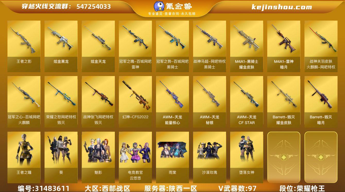 【FC-qnEcGH】【四防艾莉莎/四防云悠悠/四防荒漠琉璃/沙漠玫瑰/雨棠/还有一张扩展卷/传说辉光/传说暗裔/幻神+音效卡+白鲨+2022+电流/竞技套装/王者星神/白虎之魄/王者白虎/蓝兔/金色蔷薇+音效卡+白鲨+冠军/风神/6盘+小刚/6烈+清道夫/朱雀+音效卡/玄武/usp雷暴/冠军之特/冠军之刃/毁灭三件套/黑骑士三件套/裁决+羽掣】 陕西一区,等级100,传说武器2,王者武器10,炫金武器2,V武器97, 【英雄角色】传说艾莉莎,王者之瞳,荒漠琉璃,魅影,雨棠,电竞教官-云悠悠,葵,堕落女神,猎狐者,沙漠玫瑰, 【传说武器】传说辉光,传说暗裔, 【V武器】M200-幻神,M200-竞技荣光,Barrett-暗月传说,Barrett-毁灭,AWM-裁决,白虎-电玩蓝兔,QBZ03-金色蔷薇,RPK-盘龙,加特林-炼狱,汤姆逊-烈龙,柯尔特-冠军之特,柯尔特-竞技荣光,USP-雷暴,Knife-冠军之刃,Barrett-极光,Barrett-朱雀,AWM-天龙,HK417-朱雀,M14EBR-玄武,M4A1-雷神,M4A1-黑骑士,M4A1-黑龙,M4A1-猎神,M4A1-青龙,M4A1-武圣,M4A1-龙血,M4A1-死神,AK47-火麒麟,AK47-黑鲨,AK47-黑武士,AK47-机械迷城,AN94-超新星,AK12-天启,沙鹰-修罗,沙鹰-天神,Glock18-武圣,屠龙,麒麟刺,龙啸,擎天,擎天-竞技荣光,高爆手雷-幻灵,烟雾弹-幻灵,高爆手雷-竞技荣光,闪光弹-竞技荣光,烟雾弹-竞技荣光,高爆手雷-神工天巧,闪光弹-神工天巧,高爆手雷-云龙,烟雾弹-神工天巧,闪光弹-云龙,烟雾弹-云龙,AK-47-猩红传说, 【王者武器】王者之影,王者风神-觉醒版,王者之影-觉醒版,白虎之魄-觉醒版,王者白虎-觉醒版,王者森决-觉醒版,闪光弹-雷霆王者-觉醒版,王者星神-觉醒版,王者龙血-觉醒版,王者风神-觉醒版, 【狙击枪稀有皮肤】幻神-CFS2022,M200-幻神-荣耀世冠白鲨,幻神-电流骇客 皮肤,毁灭-荣耀之怒,毁灭耀金皮肤,毁灭-战