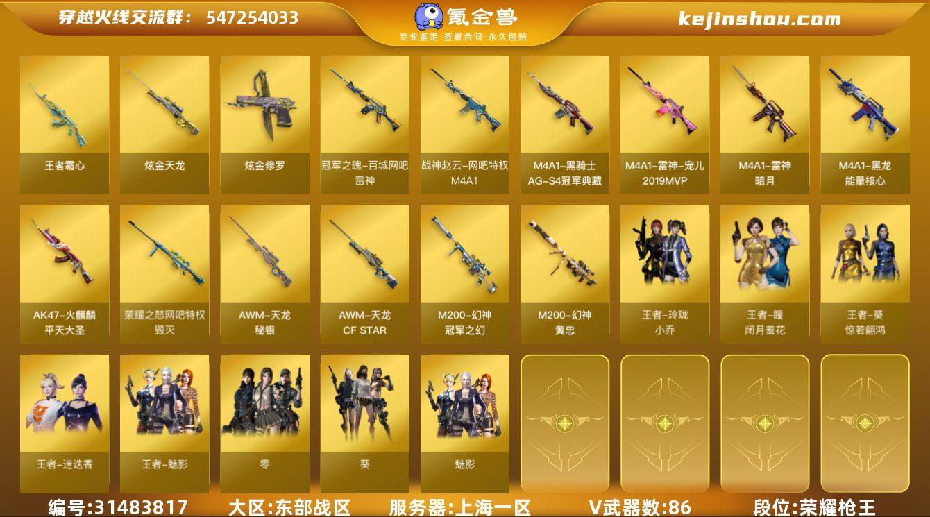 【FC-YrSZKm】【连体v9苹果7王者301皮4水晶18传说/幻兽雷/传说艾莉莎/四防王者迷迭香王者葵王者魅影王者玲珑灵狐者/晴雅/玄豹/传说光耀/幻神+冠军之幻+电竞+黄忠/星神+漫游/白虎+大汉/蓝兔/金色蔷薇+音效卡+ag+破浪/2盘2炼狱/6烈+蝴蝶/冠军之特/usp神工天巧*2/cop雷霆王者/毁灭+音效卡+荣耀/雷神+音效卡+冠军】 上海一区,等级102,传说武器1,王者武器14,炫金武器2,V武器86, 【英雄角色】传说艾莉莎,王者-魅影,王者-迷迭香,王者玲珑-小乔,玄豹,晴雅,零,魅影,葵,灵狐者-职业经理,职业选手,炽天使,幻面灵狐,猎狐者,王者葵-惊若翩鸿,王者-瞳-闭月羞花, 【传说武器】传说光耀, 【V武器】M200-幻神,Kar98K-星神,Barrett-暗月传说,Barrett-毁灭,AWM-裁决,Scar Light-白虎,白虎-电玩蓝兔,QBZ03-金色蔷薇,RPK-盘龙,加特林-炼狱,汤姆逊-烈龙,柯尔特-冠军之特,柯尔特-电竞装甲,USP-神工天巧,AWM-天龙,HK417-朱雀,M4A1-雷神,M4A1-黑骑士,M4A1-黑龙,M4A1-千变,M4A1-武圣,AK47-火麒麟,AK47-无影,AK47-机械迷城,AK47-B-战神,AN94-超新星,AK12-天启,无影-神兵利器,黑武士-锦绣游龙,机械迷城-穹宇,沙鹰-修罗,沙鹰-幻兽,Glock18-武圣,屠龙,麒麟刺,龙啸,擎天,女皇利刃-幻兽,高爆手雷-幻兽,闪光弹-幻兽,烟雾弹-幻兽,高爆手雷-玄豹,闪光弹-玄豹,烟雾弹-玄豹,闪光弹-电竞装甲,烟雾弹-电竞装甲,闪光弹-幻灵,高爆手雷-竞技荣光,闪光弹-竞技荣光,烟雾弹-竞技荣光,高爆手雷-神工天巧,闪光弹-神工天巧,高爆手雷-云龙,烟雾弹-神工天巧,闪光弹-云龙,烟雾弹-云龙,HK417-朱雀-电竞之星,屠龙-电竞之星,恶棍-电竞装甲,高爆手雷-雷霆王者,Barrett-碧霄极光,AK-47-猩红传说, 【王者武器】炼狱-悦蓝-觉醒版,王者之心-觉醒版,王者霜心,王者之魄高爆手雷,COP 3...