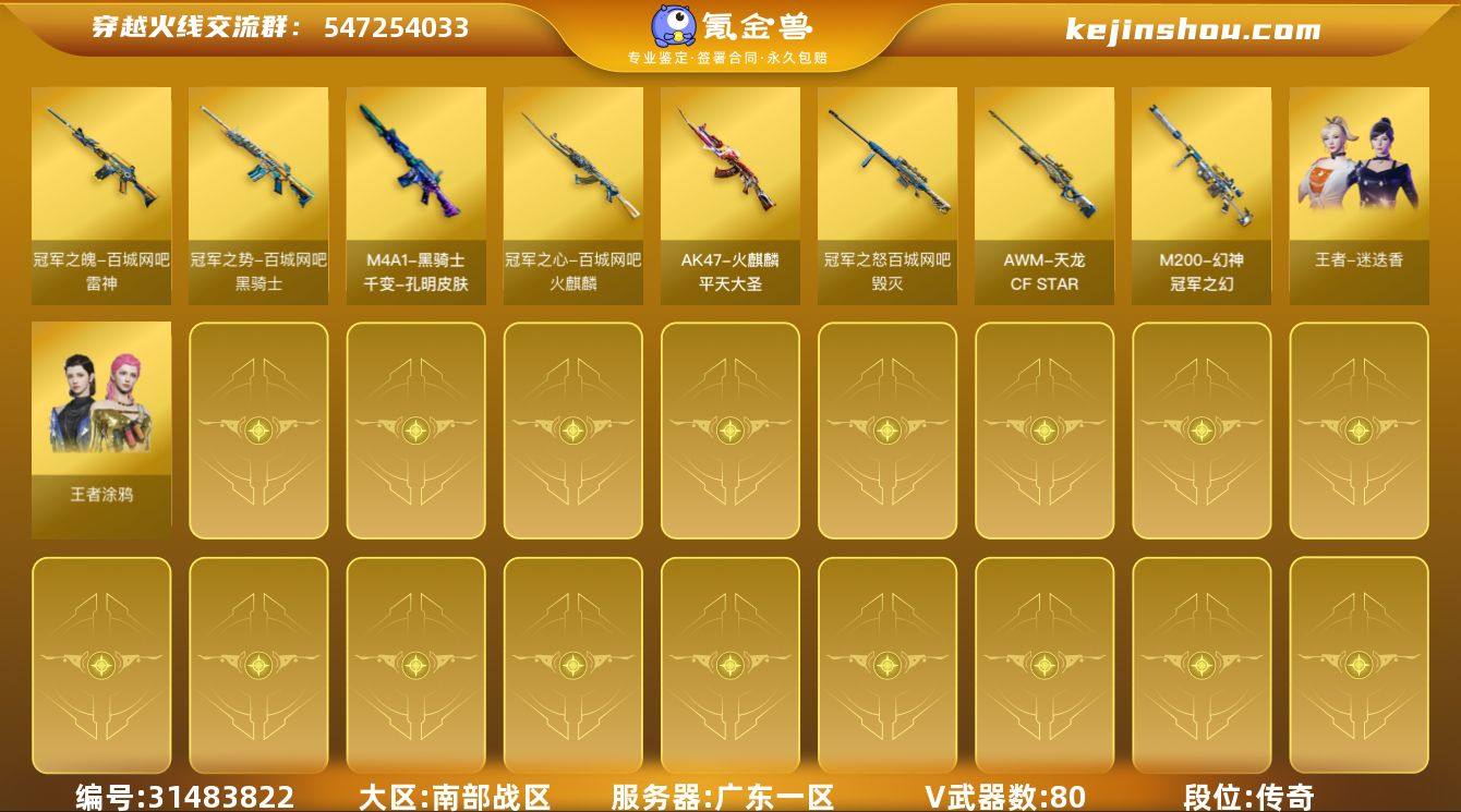 四防艾莉莎/四防星骇/四防王者迷迭香/四防王者涂鸦/传说灵眸/传说圣谕/幻神+白鲨+冠军之幻+N9/星神+璀璨/冠军之刃/冠军之特/COP幻灵*3/USP雷暴/USP神工天巧*2/裁决三件套/ 广东一区,等级102,传说武器2,王者武器8,V武器80, 【英雄角色】传说艾莉莎,传说星骇,王者-迷迭香,机械姬,云海玲珑,猎狐者,王者涂鸦, 【传说武器】传说灵眸,传说圣谕, 【V武器】M200-幻神,Kar98K-星神,Barrett-毁灭,AWM-裁决,SCAR Light-玄豹,QBZ03-金色蔷薇,炼狱-百战金芒,烈龙-云海游龙,柯尔特-冠军之特,USP-雷暴,USP-神工天巧,COP 357-幻灵,Knife-冠军之刃,HK417-朱雀,M14EBR-玄武,M4A1-雷神,M4A1-黑骑士,M4A1-黑龙,M4A1-千变,M4A1-猎神,M4A1-青龙,M4A1-死神,AK47-火麒麟,AN94-超新星,烈火-动感闪耀,AA-12-雷霆,玫瑰精灵-蓝调梦幻,无影-神兵利器,黑武士-锦绣游龙,机械迷城-穹宇,沙鹰-修罗,沙鹰-天神,天神-动感闪耀,麒麟刺,龙啸,擎天,幻灵之锋,屠龙-动感闪耀,龙啸-烈火龙威,擎天-云海游龙,麒麟刺-百战金芒,高爆手雷-玄豹,烟雾弹-玄豹,高爆手雷-幻灵,闪光弹-幻灵,烟雾弹-幻灵,高爆手雷-神工天巧,闪光弹-神工天巧,烟雾弹-神工天巧,手雷-云海游龙,死神-雪域霜狐,Barrett-碧霄极光,手雷-动感闪耀,M4A1-再燃火线, 【王者武器】王者之魄高爆手雷,王者之魄闪光弹,王者森决-觉醒版,王者冰锋, 【狙击枪稀有皮肤】幻神-冠军之幻,M200-幻神-荣耀世冠白鲨,M200-幻神-N9-2022MVP,星神-璀璨皮肤,裁决-运输船 皮肤,毁灭-冠军之怒,毁灭-黑曼巴 皮肤,天龙-CFSTAR, 【步枪稀有皮肤】雷神-冠军之魄,火麒麟-CFSTAR,火麒麟-冠军之心,火麒麟-心动糖果,火麒麟-平天大圣,黑骑士-冠军之势,M4A1-千变-孔明皮肤,黑骑士-摸金校尉,QBZ03-巅峰荣耀皮肤,无影-神兵利器 皮肤, 【