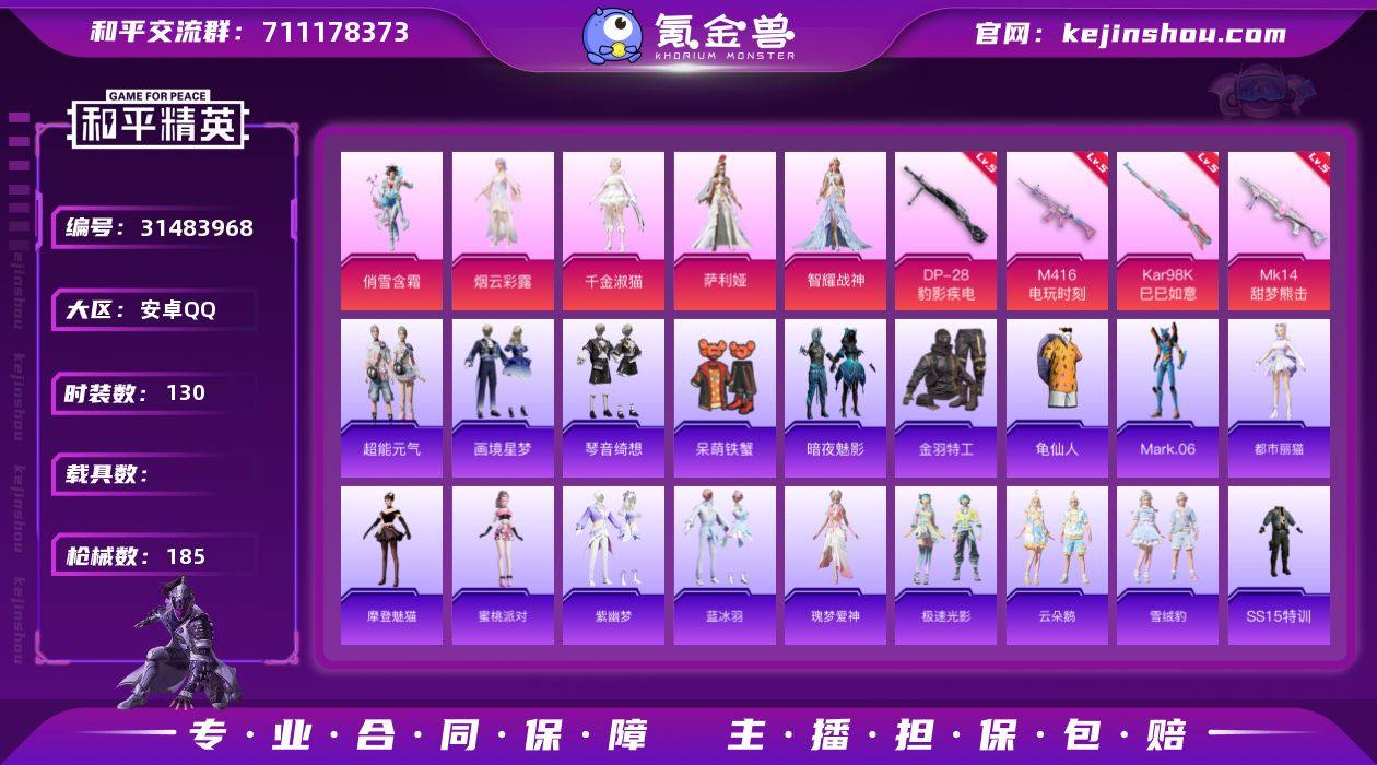 无二次安卓 手Q-5粉装-4特效枪-0载具-2粉色飞行器-53670热力值-6王牌印记-130套装-185枪皮LK262128 【热门品类】:套装-金羽特工,套装-龟仙人,角色-Mark.06 【粉色套装】:粉装-俏雪含霜,角色-烟云彩露,角色-千金淑猫,角色-萨利娅,角色-智耀战神 【粉色枪皮等级】:M416-电玩时刻(五级),Kar98K-巳巳如意(五级),Mk14-甜梦熊击(五级),DP-28-豹影疾电(五级) 【粉色枪皮】:M416-电玩时刻,Kar98K-巳巳如意,Mk14-甜梦熊击,DP-28-豹影疾电 【粉色飞行器】:齐天大圣飞行器 【粉色降落伞】:梦幻火箭降落伞,天之羽翼降落伞,江南烟雨降落伞,千金淑猫降落伞,临安公主降落伞,幻彩电音降落伞,炫彩糖果降落伞 【稀有套装】:套装-龟仙人,套装-超能元气,套装-雪国风尚,套装-炫彩糖果,角色-都市丽猫,角色-摩登魅猫,角色-蜜桃派对,套装-紫幽梦,套装-蓝冰羽,角色-瑰梦爱神,套装-极速光影,套装-云朵鹅,套装-雪绒豹,套装-画境星梦,套装-琴音绮想 【稀有枪皮】:AUG-冰晶雪宝,AKM-奇异狩猎者,AKM-彩虹符号,AKM-破晓战魂,AKM-萌趣颜团子,AKM-虎虎生威,M16A4-幻世战舞者,M16A4-甜心亚梦,M16A4-红色方程式,M16A4-蓝色火焰,M16A4-千金淑猫,SCAR-L-炫彩节奏,SCAR-L-玉兔迎春,SCAR-L-红色方程式,M416-糯团青竹,M416-红色方程式,M416-蓝色火焰,GROZA-异彩先驱,GROZA-蓝莓炮弹,AUG-幻影战神,AUG-耀粉歌者,AUG-绝对恒星,QBZ-彩虹符号,M762-奇异狩猎者,M762-瑞龙福将,M762-云朵鹅,M762-登顶巅峰,G36C-暗夜玫瑰,AC-VAL-天降萌叽,AC-VAL-快闪甜心,AC-VAL-甜心亚梦,蜜獾-天降萌叽,蜜獾-娇憨猪猪,ACE32-画境星梦,UZI-啾咪啾咪,UZI-天降萌叽,UZI-娇憨猪猪,UZI-炫彩节奏,UZI-红色方程式,UZI-月影灵韵,UMP45-夜灯,UMP45-生命誓言,UMP45-蓝色火焰,UMP45-绒宝小鹅,Vector-...