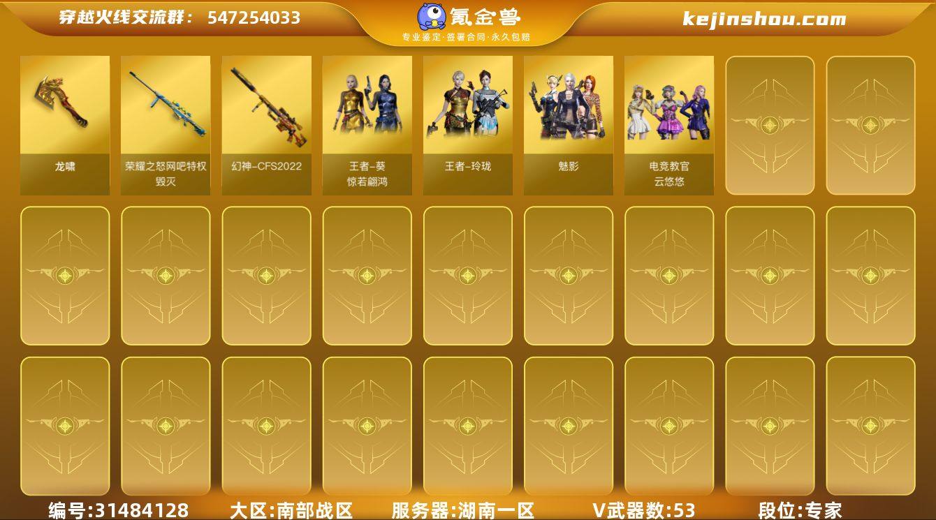 【FC-22GRUR】【四防云悠悠/四防王者葵/传说暗裔/幻神+2022/竞技荣光套/白虎/蓝兔/6烈+蝴蝶/冠军之特】 湖南一区,等级100,传说武器1,王者武器1,V武器53, 【英雄角色】王者凌霄,王者玲珑,魅影,电竞教官-云悠悠,职业选手,猎狐者,樱-缤纷夏日,王者葵-惊若翩鸿, 【传说武器】传说暗裔, 【V武器】M200-幻神,M200-竞技荣光,Barrett-暗月传说,Barrett-毁灭,Scar Light-白虎,白虎-电玩蓝兔,RPK-盘龙,汤姆逊-烈龙,柯尔特-冠军之特,柯尔特-竞技荣光,Barrett-极光,Barrett-朱雀,M14EBR-玄武,M4A1-雷神,M4A1-黑骑士,M4A1-龙血,AK47-火麒麟,AK47-麒麟,AK47-B-身先士卒,AK47-B-战士,AK47-B-常胜将军,AN94-超新星,无影-神兵利器,沙鹰-修罗,沙鹰-天神,屠龙,龙啸,擎天,擎天-竞技荣光,闪光弹-电竞装甲,高爆手雷-幻灵,烟雾弹-幻灵,高爆手雷-竞技荣光,闪光弹-竞技荣光,烟雾弹-竞技荣光,AK-47-猩红传说, 【王者武器】王者之刺-觉醒版, 【狙击枪稀有皮肤】幻神-CFS2022,毁灭-荣耀之怒, 【步枪稀有皮肤】雷神-荣耀之魄,M4A1-雷神-CFS 2019,战神-粉色甜心皮肤,AK-47-雷神,黑骑士-摸金校尉,AK47-B-常胜将军-孙权,AK47-B-常胜将军-刘备,AK47-B-常胜将军-曹操,战神-流金岁月皮肤,战神-紫绶金章皮肤, 【近身武器稀有皮肤】屠龙-荣耀之锋, 【小人枪】烟雾弹-Orange-虎牙娘,魔能飞环-曼陀罗,迷你生化手雷,AWM-灵狐-15周年嘉年华,冰火魔兽,斯泰尔-蝴蝶,闪光弹-貂蝉,高爆手雷-大乔,雷神-小红, 【武器】加利尔ACE-零号,源-黑龙,魂·炼狱-玩具枪,源·龙啸,源·天神,源·天龙,源·天启,源·雷神,源·机械迷城,源·火麒麟,冰龙粉碎者-白马银枪,G36C-宇航兔兔,凤凰之息, 【挑战大师】阐释者III,荣耀之证-荣耀之巅,试炼破坏者III,激光毁灭者II,神圣爆裂者III,