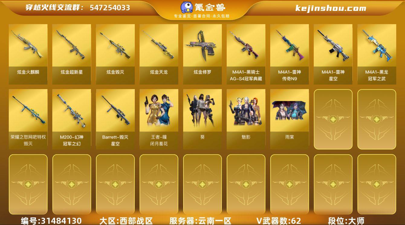 【FC-5AV9W2】 四防影煞/传说破晓/幻神+冠军之幻+宠儿+N9+电流/白虎+冠军之虎/1盘5炼狱/5烈+蝴蝶/冠军之特/USP雷暴/COP云龙/炽芒蝶刃/幻影/金蚀/QBZ+巅峰/王者星霆/王者冰魄/王者之势/ 云南一区,等级100,传说武器1,王者武器8,炫金武器8,V武器62, 【英雄角色】传说影煞,关小雨,雨墨,晴雅,魅影,雨棠,葵,云海玲珑,灵动武士,铁骑-乘风破浪,雷霆-α,猎狐者,王者-瞳-闭月羞花, 【传说武器】传说破晓, 【V武器】M200-幻神,Barrett-暗月传说,Barrett-毁灭,G36C-幻影,VSK-94-金蚀,Scar Light-白虎,白虎-电玩蓝兔,QBZ03-金色蔷薇,RPK-盘龙,加特林-炼狱,汤姆逊-烈龙,柯尔特-冠军之特,USP-雷暴,COP 357-云龙,炽芒蝶刃,Barrett-极光,M4A1-雷神,M4A1-黑骑士,M4A1-黑龙,M4A1-龙血,M4A1-死神,AK47-火麒麟,AK47-无影,AK47-黑鲨,AK47-黑武士,AK47-机械迷城,AN94-超新星,9A91-烈火,AA-12-雷霆,黑武士-锦绣游龙,沙鹰-修罗,沙鹰-天神,屠龙,麒麟刺,龙啸,斩神刀-雷暴,高爆手雷-雷暴,闪光弹-雷暴,烟雾弹-雷暴,高爆手雷-云龙,闪光弹-云龙,超新星-热带奇洋,龙啸-热带奇洋,手雷-热带奇洋,AK-47-猩红传说, 【王者武器】王者猎神,炼狱-悦蓝-觉醒版,凤吟之魄,王者之势-觉醒版,王者之魄-觉醒版,王者星霆,王者冰魄-觉醒版, 【狙击枪稀有皮肤】幻神-冠军之幻,幻神-宠儿-2021MVP,M200-幻神-N9-2022MVP,幻神-电流骇客 皮肤,Kar98K-星神-冠军之星皮肤,毁灭-荣耀之怒,毁灭-星空,极光-能量核心,巴雷特-毁灭-CFPL冠军, 【步枪稀有皮肤】雷神-HeartShot 皮肤,雷神-荣耀之魄,雷神-R.LGD-CFPLS18冠军,雷神-星空,雷神-能量核心,雷神-传奇N9,黑骑士-AG-S4冠军典藏,黑鲨-电流骇客 皮肤,黑龙-冠军之武,QBZ03-巅峰荣耀