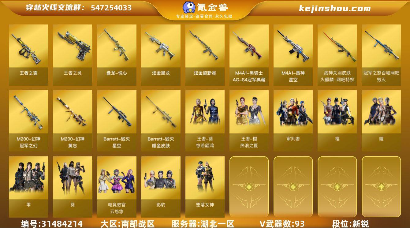 【FC-H3Z3PA】【四防角色10个还有一张扩展卷(云悠悠/荒漠琉璃/隼/影豹/王者春/王者葵/王者潘多拉/王者影豹/王者炫/灵狐者)传说暗裔/传说梦魇/幻神+冠军之幻+丹凤+黄忠/竞技荣光套/星神/王者星神/白虎/玄武/金色蔷薇+白鲨/6盘/6烈/usp雷暴/cop幻灵*2】 湖北一区,等级102,传说武器2,王者武器11,炫金武器2,V武器93, 【英雄角色】王者潘多拉,王者影豹,王者炫,王者春,隼,荒漠琉璃,审判者,零,樱,影豹,电竞教官-云悠悠,葵,瞳,灵狐者-职业经理,堕落女神,雷霆-α,兰-海滩派对,王者樱-热浪之夏,王者葵-惊若翩鸿, 【传说武器】传说梦魇,传说暗裔, 【V武器】M200-幻神,M200-竞技荣光,Kar98K-星神,Barrett-毁灭,AWM-裁决,Scar Light-白虎,QBZ03-金色蔷薇,RPK-盘龙,加特林-炼狱,汤姆逊-烈龙,柯尔特-竞技荣光,USP-雷暴,COP 357-幻灵,Barrett-极光,AWM-天龙,HK417-朱雀,M14EBR-玄武,M4A1-雷神,M4A1-黑骑士,M4A1-黑龙,M4A1-千变,M4A1-青龙,M4A1-玫瑰精灵,M4A1-武圣,M4A1-死神,AK47-火麒麟,AK47-无影,AK47-黑鲨,AK47-黑武士,AN94-超新星,9A91-烈火,AK12-天启,AA-12-雷霆,沙鹰-修罗,沙鹰-天神,Glock18-武圣,屠龙,麒麟刺,龙啸,擎天,擎天-竞技荣光,马来剑-夜魔,龙啸-烈火龙威,高爆手雷-夜魔,闪光弹-夜魔,烟雾弹-夜魔,高爆手雷-竞技荣光,闪光弹-竞技荣光,烟雾弹-竞技荣光, 【王者武器】王者之霆,王者之灵,玫瑰精灵-悦动,王者之影-觉醒版,盘龙-悦心,王者之锋-觉醒版,王者之魄-觉醒版,王者星神-觉醒版, 【狙击枪稀有皮肤】M200-幻神-黄忠皮肤,幻神-冠军之幻,毁灭耀金皮肤,毁灭-星空,毁灭-冠军之怒,毁灭-魔灵皮肤,毁灭-枪娘巴雷特,极光-能量核心, 【步枪稀有皮肤】雷神-星空,雷神-赛博朋克,火麒麟-战神关羽,黑骑士-AG-S4冠军典藏