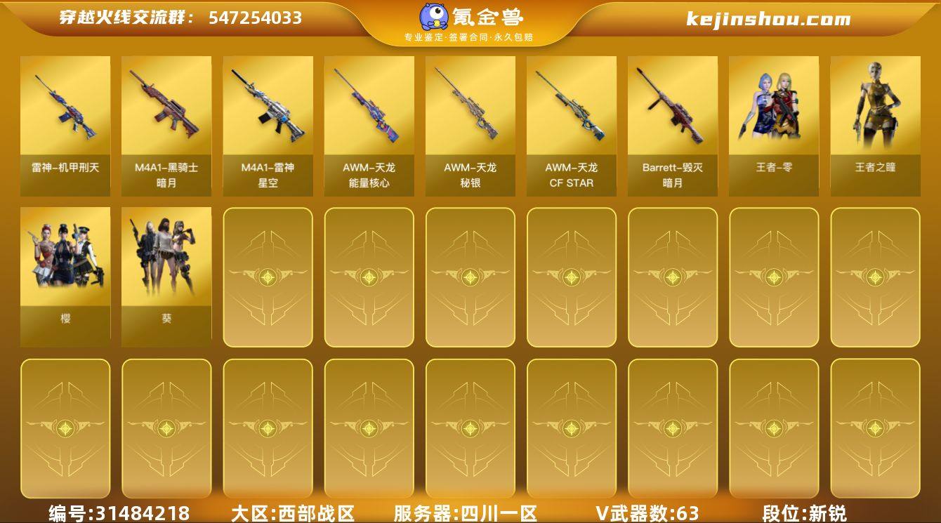 【FC-ZD68WG】传说辉光/幻神/竞技荣光狙/6黑骑士/王者星神/白虎电玩+QBZ蔷薇/炼狱6盘龙/6烈龙/ 【英雄角色】王者之瞳,樱,葵,灵狐者-黄金海岸,雷霆-α,猎狐者,王者-零, 【传说武器】传说辉光, 【V武器】M200-幻神,M200-竞技荣光,Barrett-毁灭,AWM-裁决,白虎-电玩蓝兔,QBZ03-金色蔷薇,RPK-盘龙,加特林-炼狱,炼狱-百战金芒,汤姆逊-烈龙,Barrett-极光,AWM-天龙,M4A1-雷神,M4A1-黑骑士,M4A1-死神,M4A1-凌龙-I,AK47-火麒麟,AK47-黑武士,AK47-B-常胜将军,AN94-超新星,AK12-天启,机械迷城-穹宇,沙鹰-修罗,沙鹰-天神,屠龙,麒麟刺,龙啸,擎天,擎天-竞技荣光,麒麟刺-百战金芒,高爆手雷-竞技荣光,闪光弹-竞技荣光,烟雾弹-竞技荣光,M4A1-再燃火线,AK-47-猩红传说, 【王者武器】王者之刺-觉醒版,王者冰锋,王者星神-觉醒版,王者之怒-觉醒版, 【狙击枪稀有皮肤】毁灭-暗月,天龙-能量核心,天龙-CFSTAR,天龙-秘银,毁灭-青帝, 【步枪稀有皮肤】雷神-机甲刑天皮肤,雷神-星空,雷神-能量核心,火麒麟-CFSTAR,黑骑士-暗月,死神-秘银,黑龙-暗月,天启-暗月,战神-流金岁月皮肤,无影-暗月,无影-能量核心, 【机枪稀有皮肤】炼狱- 迷彩 皮肤, 【副武器稀有皮肤】修罗-CFSTAR, 【近身武器稀有皮肤】屠龙-荣耀之锋,麒麟刺-萌杀皮肤, 【音效道具】炼狱-百战金芒-庆典舞曲音效卡, 【小人枪】迷你波特博士,黄金迷你裂空之翼,迷你生化手雷,生化手雷-机甲核心,生化手雷-小钢,冰火魔兽,迷你火种,火麒麟-零·纪元,迷你深渊冰龙,KAC锯式机枪-黑桃战神, 【武器】手雷-2017万圣节,死亡之眼,加利尔ACE-零号,激光毁灭者III,冰龙粉碎者-白马银枪,征服者-超越觉醒 [Lv 4],神罚,AK47-青龙, 【挑战大师】集束激光-超越MAX,荣耀之证-荣耀之巅,征服者,机甲撕裂者III,激光毁...