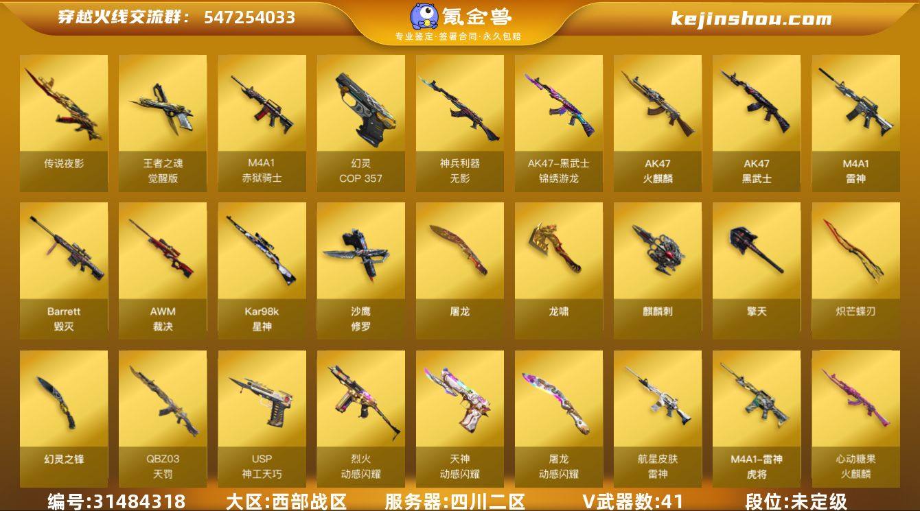 四川二区-54V-9王者武器数-0炫金武器数 【传说武器】:传说夜影 【传说角色】:传说艾莉莎 【热门武器】:传说夜影,Kar98K-星神,羊驼玩偶,COP 357-幻灵,沙鹰-修罗*3,炽芒蝶刃,金刚伞 【音效卡】:天神-动感闪耀 音效卡,M4A1-雷神音效卡,Barrett-毁灭音效卡,火线妹语音包 【皮肤】:裁决-过载 皮肤,星神-璀璨皮肤,雷神-虎将*2,雷神-脉冲核心,雷神-维纳斯皮肤,雷神-航星皮肤,火麒麟-华夏之心,火麒麟-轻羽皮肤,火麒麟-心动糖果,毁灭耀金皮肤,毁灭-冠军之怒,毁灭-直播专属,毁灭-英雄计划 皮肤,黑武士-典韦皮肤,龙啸-青青莓果 皮肤 【角色】:隼,王者凌霄,乔伊教练,暗夜-X,电竞少女,飞虎队-X,风暴女,嘉年华灵狐,娟娟,零-水下丽影,灵狐者-X,麻雀,曼陀罗-X,女主播,潘多拉-X,潘多拉-甜心教官,斯沃特-X,铁骑荣耀,兔囡囡,维纳斯,雪莉杨-摸金校尉,影武者-X 【人偶武器】:AWM-灵狐-15周年嘉年华,M37-葵,迷你深渊冰龙,迷你波特博士,迷你巨石泰坦-魔花研究所,沙鹰-夜玫瑰 【暴走生化】:超级对讲机 【挑战大师】:激光毁灭者III-白马银枪,神圣爆裂者-末日III 【英雄级武器】:AK47-火麒麟,M4A1-雷神,AK47-黑武士,QBZ03-天罚,无影-神兵利器,黑武士-锦绣游龙,FAMAS G2-天戎,烈火-动感闪耀,王者冰魄-觉醒版,王者火魄-觉醒版,QBZ-03-王者蔷薇-觉醒版,白虎之魄-觉醒版,王者芳薇-觉醒版,加利尔ACE-天袭,Barrett-毁灭,AWM-裁决,Kar98K-星神,王者之怒-觉醒版,王者风神-觉醒版,沙鹰-修罗*3,COP 357-幻灵,USP-神工天巧,王者之魂-觉醒版,天神-动感闪耀,屠龙*2,龙啸,擎天,麒麟刺,幻灵之锋,炽芒蝶刃,屠龙-动感闪耀,王者之锋-觉醒版,高爆手雷-幻灵*3,高爆手雷-神工天巧,手雷-动感闪耀,闪光弹-幻灵*2,闪光弹-神工天巧*2,烟雾弹-幻灵*2,烟雾弹-神工天...