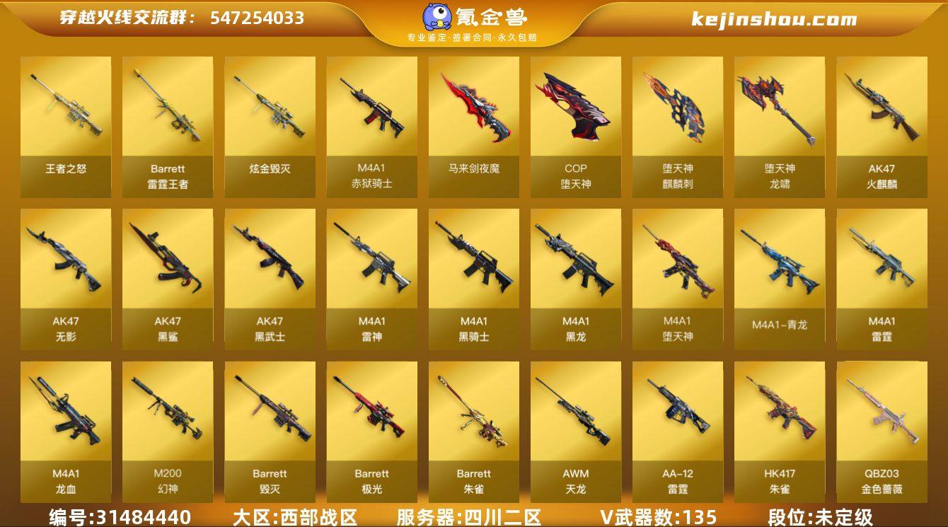 四川二区-139V-12王者-4炫金 【热门武器】:QBZ03-金色蔷薇,HK417-朱雀,M4A1-青龙,M200-幻神,金色小号,C.A.T,M4A1-黑骑士*2,汤姆逊-烈龙*6,RPK-盘龙*6,加特林-炼狱*2,火麒麟-绝迹,COP-堕天神*2,沙鹰-修罗*6 【王者炫金武器】:王者之怒,Barrett-雷霆王者,炫金骑士*2,炫金武士,炫金毁灭 【音效卡】:AK47-火麒麟音效卡,M4A1-雷神音效卡,M4A1-黑骑士音效卡,Barrett-毁灭音效卡,Barrett-碧霄极光音效卡 【皮肤】:雷神-暗月*2,雷神-荣耀之魄*2,雷神-星空*2,雷神-虎将,雷神-耀金皮肤,雷神-机甲刑天皮肤,火麒麟-雷神,火麒麟-华夏之心,AK47-火麒麟-传奇EVEN,火麒麟-盘古,火麒麟-百城,毁灭耀金皮肤,毁灭-星空,M4A1-千变-孔明皮肤,黑龙-能量核心,黑龙-暗月,M4A1-黑龙-361,黑骑士-暗月,黑骑士耀金皮肤,无影耀金皮肤,AK47-黑武士-361,战神-粉色甜心皮肤,战神-紫绶金章皮肤,战神-流金岁月皮肤,天龙-能量核心,AWM-天龙-传奇白鲨,极光-能量核心,修罗-能量核心,修罗耀金皮肤*2,修罗-星空,屠龙-惊鸿 皮肤 【角色】:零,魅影,炫,迷迭香,王者-瞳-闭月羞花,修道士,炽天使,空,芳心审判者,风暴女,兰-新年限定,麻雀,潘多拉-X,潘多拉-甜心教官,蛇姬,新娜塔莎,雪莉杨,夜玫瑰-幻能朋克,樱-战斗天使,影武者-X,幽 【人偶武器】:火麒麟-绝迹,火麒麟-灵狐,巴雷特-零-水下丽影,AWM-灵狐-15周年嘉年华,M37-葵,C.A.T,闪光弹-小乔 【挑战大师】:VEPR-12-金魔,激光毁灭者III 【英雄级武器】:AK47-火麒麟,M4A1-黑龙*2,M4A1-雷神*6,M4A1-黑骑士*2,AK47-无影,AK47-黑武士,AK47-黑鲨*3,M4A1-龙血*2,M4A1-雷霆,M4A1-青龙,M4A1-堕天神,HK417-朱雀,QBZ03-金色蔷薇,王者之魄-觉醒版,AK-47-猩红传说*18,AK47-B-战