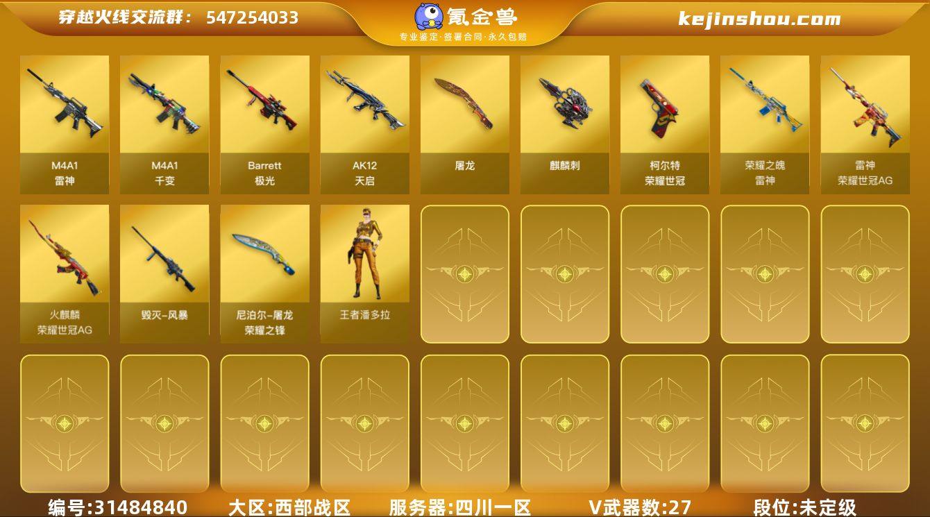 四川一区-30V-2王者-0炫金 【热门武器】:荣耀世冠-柯尔特,羊驼玩偶 【王者炫金武器】:王者森力 【音效卡】:Barrett-碧霄极光音效卡 【皮肤】:雷神-荣耀之魄,雷神-荣耀世冠AG,M4A1-再燃火线,火麒麟-荣耀世冠AG,毁灭-风暴,天启-高能霹雳 皮肤,屠龙-荣耀之锋,轻型军用手斧-再燃火线 【角色】:玄豹,王者潘多拉,乔伊教练,修道士,云海玲珑,芳心审判者,娟娟,龙儿,龙儿-小淘气,潘多拉-甜心教官,甜心偶像,雪莉杨 【人偶武器】:AWM-灵狐-15周年嘉年华,生化手雷-机甲核心 【挑战大师】:冰龙粉碎者-白马银枪 【英雄级武器】:M4A1-千变,M4A1-雷神,AK12-天启*2,SCAR Light-玄豹,Barrett-极光,王者之怒-觉醒版,荣耀世冠-柯尔特,屠龙*2,麒麟刺,麒麟刺-百战金芒,丛林匕首-玄豹,高爆手雷-玄豹*5,闪光弹-玄豹*2,烟雾弹-玄豹*3,M4A1-苍鸣雷神,Barrett-碧霄极光 【道具】:BS战队炫彩背包,炫彩背包,百战金芒炫彩背包,女皇终结者-魔龙之吻,绿色巨人,灵魂忍者,迷雾幽灵,夺命之镰,防化服*3,星辰流光-枪王排位,流光-鎏金之域,语音特效-盛典烟火,萌萌小葵表情,防弹头盔*6,防弹衣*6,C4工具钳*6,手雷包*6 【特殊枪械】: