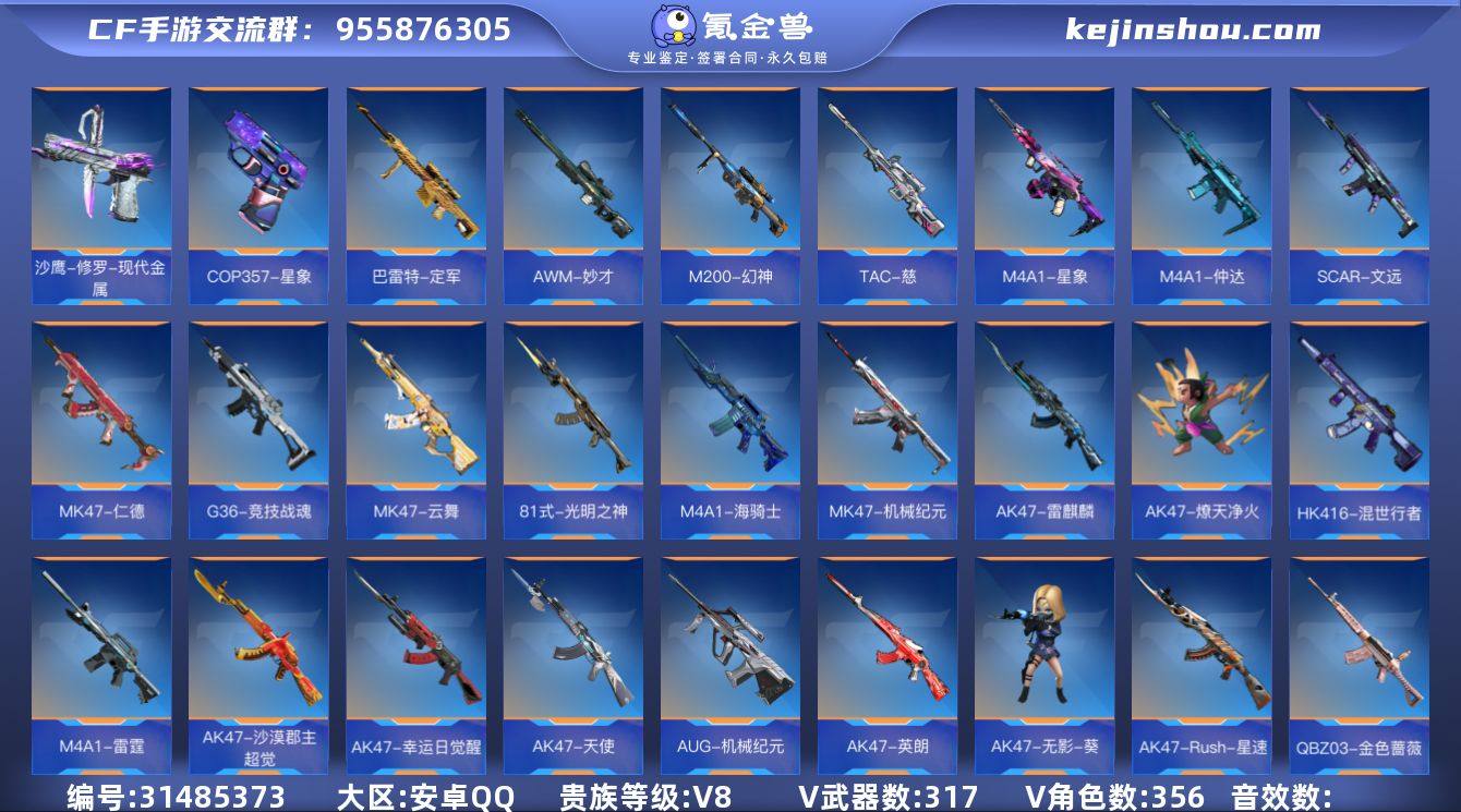 【FC-psjs1L】安卓QQ,成人号:是,角色等级:156,实名:有修改人脸机会/实名是本人,段位:枪皇S,VIP等级:V8,V武器数量:356,V角色数量:9,V总数量:317,王者武器数:28,万化数量:783, 【人物角色】雾萌萌,关小雨,海滩夜玫瑰,子涵,夏日灵狐,暗影,春节兰,圣诞灵狐,魅惑灵狐,潘多拉,斯沃特,祝融夫人,炽天使-X,云悠悠-心动起点,蝉,零-水下丽影,麻雀,职场灵狐-赛事经理,斯薇特, 【王者武器】王者之誉,王者之兽,蝴蝶刀-天神,唐刀-华夏传说,M12S-雷霆王者,王者之蝶,王者之心手雷,王者之兽手雷,王者之心烟雾弹,王者之心闪光弹,王者之翼闪光弹,王者之兽闪光弹,王者之影闪光弹,王者之兽烟雾弹,王者之影烟雾弹,王者之翼烟雾弹,王者之心,王者之影,王者之怒,王者之魂,王者之击,王者之烈,王者之迹,王者之神,王者之狱,王者之腾,王者之仞,王者之隐, 【至尊套装】兽至尊,腾至尊, 【带V枪械】47-云舞-千变,AWM-天龙-英雄战甲,王者之心闪光弹-冰霜奇迹,王者之心烟雾弹-HeartShot,G36-竞技战魂,M4A1-海骑士,AK47-无影-枪神之影,M4A1-雷霆,M4A1-仲达,M4A1-星象,沙鹰-火麒麟-寒霜,沙鹰-修罗-枪圣之魂,M4A1-天使,M4A1-玫瑰精灵,M4A1-死神,M4A1-黑龙,M4A1-黑骑士,M4A1-雷神,47-云舞,47-机械纪元,47-仁德,双持沙鹰-金银双煞-千变,AK47-雷麒麟,AK47-燎天净火,AK47-沙漠郡主-超觉,AK47-幸运日觉醒,AK47-天使,COP 357-堕天神,M4A1-雷神-枪神之魄,AK47-英朗,AK47-无影-葵,AK47-Rush-星速,AK47-黑武士觉醒,AK47-火麒麟,AK47-无影,81式-光明之神,AN94-卷帘大将军,AN94-超新星,HK416-混世行者,M14EBR-暗夜,AUG-机械纪元,SCAR-文远,QBZ03-湮灭,QBZ03-金色蔷薇,98K-血月,98K-黑骑士,AK12-天启,M200-心动次元觉醒,M200-
