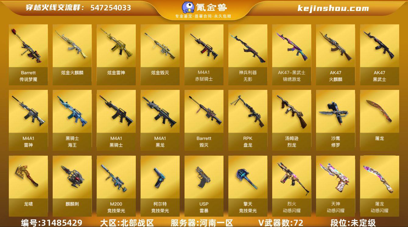 河南一区-78V-3王者武器数-3炫金武器数 【传说武器】:传说梦魇 【热门武器】:传说梦魇,M200-竞技荣光,死亡之眼,M4A1-黑骑士,汤姆逊-烈龙*6,RPK-盘龙*5,加特林-炼狱*2,斯泰尔-蝴蝶,USP-雷暴,沙鹰-修罗 【王者炫金武器】:炫金火麒麟,炫金雷神,炫金毁灭 【音效卡】:M4A1-黑骑士音效卡,Barrett-碧霄极光音效卡,炼狱-百战金芒-庆典舞曲音效卡 【皮肤】:金色蔷薇-电竞之星 皮肤,M4A1-再燃火线,雷神-神秘按键 皮肤,火麒麟-雷神,火麒麟-平天大圣,火麒麟-百城,火麒麟-心动糖果,毁灭-魔灵皮肤,毁灭-英雄计划 皮肤,黑龙-墨子皮肤,黑骑士-暗月*2,黑骑士耀金皮肤,无影-能量核心,黑武士-典韦皮肤,炼狱-星空*2,龙啸-醒狮 皮肤,轻型军用手斧-再燃火线 【角色】:电竞教官-云悠悠,王者葵-惊若翩鸿,乔伊教练,暗夜-X,初恋灵狐,芳心审判者,飞虎队-X,虎妞,嘉年华灵狐,娟娟,兰妹妹,灵狐者-X,麻雀,曼陀罗-X,潘多拉-X,潘多拉-甜心教官,潜龙队-X,青霞仙子,斯沃特-X,蜀雪,铁骑荣耀,兔囡囡,游珑儿 【人偶武器】:斯泰尔-蝴蝶,AWM-灵狐-15周年嘉年华*5,迷你牛魔王,迷你波特博士,夺魂,迷你牛牛,迷你生化手雷*2,生化手雷-机甲核心,深渊终结者手雷,迷你艾比,灵狐娃娃手雷*3 【暴走生化】:死亡之眼,超级对讲机 【挑战大师】:激光毁灭者III-白马银枪,神圣爆裂者-末日III 【英雄级武器】:AK47-火麒麟,M4A1-黑龙,M4A1-雷神*2,M4A1-黑骑士,AK47-黑武士,无影-神兵利器,黑武士-锦绣游龙,烈火-动感闪耀,王者冰魄-觉醒版,黑骑士-海王,王者之烈-觉醒版,QBZ-03-王者蔷薇-觉醒版,Barrett-毁灭,M200-竞技荣光,RPK-盘龙*5,加特林-炼狱*2,炼狱-百战金芒,汤姆逊-烈龙*6,沙鹰-修罗,USP-雷暴,柯尔特-竞技荣光,天神-动感闪耀,屠龙,龙啸,麒麟刺,擎天-竞技荣光*6,屠...