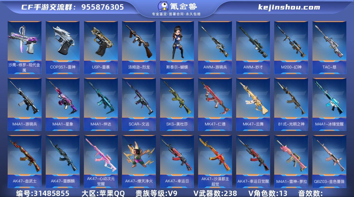 实名: 可修改 贵族等级: V9 v武器: MK47-云舞,81式-光明之神,M4A1-冰锋觉醒,AK47-血武士,MK47-仁德,AK47-雷麒麟,AK47-心动次元觉醒,AK47-燎天净火,AK47-幸运日觉醒,SKS-美杜莎,AK47-沙漠郡主-超觉,SCAR-文远,M4A1-仲达,M4A1-雷神-萝拉,M4A1-星象,AN94-超新星,QBZ03-湮灭,M4A1-游骑兵,AK47-沙漠领主,M4A1-死神,M4A1-黑龙,M4A1-黑骑士,M4A1-雷神,TAC-慈,MR1-龙吟惊沧海,M200-幻神,98K-黑骑士,AWM-妙才,AWM-裁决,巴雷特-安琪拉,巴雷特-金色蔷薇,AWM-游骑兵,09式狙-天神,AWM-天龙,RPK-美杜莎,加特林-蟒蛇,MG36-黑骑士,加特林-堡垒觉醒,RPK-赤炎盘龙,CZS2-善财童子,斯泰尔-蝴蝶,MK5-极光,MK5-机械纪元,汤姆逊-烈龙,KSG-火力竞放觉醒,蟒蛇-火力竞放觉醒,MK23-幻神,USP-雷暴,MK23-瑜,消音沙鹰-牛魔王,MK23-机械纪元,双管猎枪-黑骑士,COP357-雷神,沙鹰-无影,沙鹰-天神,USP-神罚,沙鹰-修罗,AK47-幸运日,QBZ03-金色蔷薇,M4A1-樱龙·二觉,沙鹰-修罗-现代金属 王者武器: 王者之戮,王者之翼,王者之心,王者之烈,王者之神,王者之迹,王者之电,王者之轮,王者之魂,王者之锋,王者之啸,王者之狱,王者之隐,王者之击,M12S-雷霆王者,M4A1-雷霆王者,雷霆王者之锋 v角色: 职场灵狐-赛事经理,云悠悠,蝴蝶,...