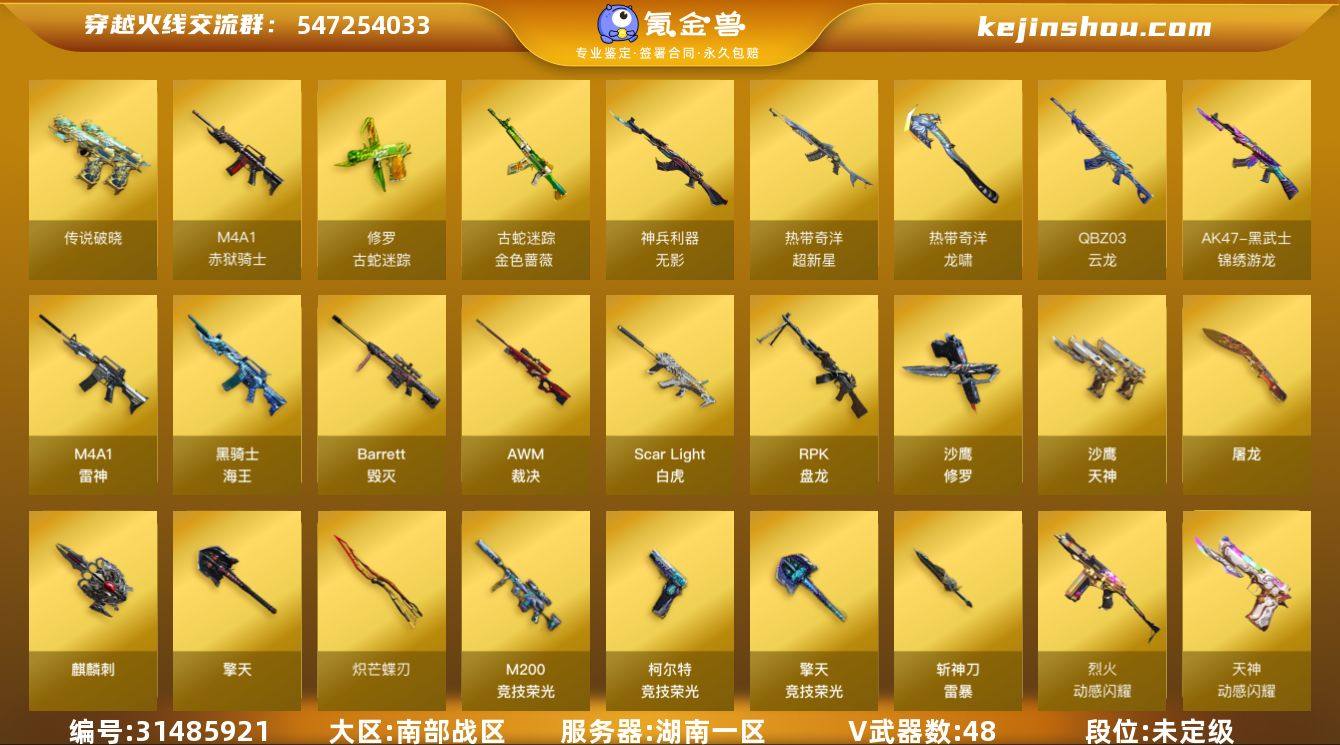 湖南一区-51V-3王者武器数-0炫金武器数 【传说武器】:传说破晓 【传说角色】:传说影煞 【热门武器】:传说破晓,Scar Light-白虎,金色蔷薇-古蛇迷踪,修罗-古蛇迷踪,M200-竞技荣光,炼狱-迷你小钢,RPK-盘龙*5,裁决-雪莉杨,沙鹰-修罗,炽芒蝶刃 【音效卡】:黑龙-古蛇迷踪音效卡,Scar Light-白虎音效卡 【皮肤】:雷神-暗月,雷神-化蛇 皮肤,火麒麟-平天大圣,毁灭-秦师 皮肤,炼狱-星空 【角色】:葵,电竞教官-云悠悠,晴雅,战地猎狐,王者零-华冠丽服,蛇隐宗,奇洋探员,乔伊教练,云海玲珑,空,暗夜-X,芳心审判者,飞虎队-X,风暴女,嘉年华灵狐,兰妹妹,猎狐者-追月,0号玩家,灵狐者-X,灵狐者-黄金海岸,龙儿,麻雀,曼陀罗-X,娜塔莉娅,蛇姬,夜玫瑰-宠粉,游珑儿 【人偶武器】:裁决-雪莉杨,火麒麟-灵狐,炼狱-迷你小钢,AWM-灵狐-15周年嘉年华,迷你深渊冰龙,迷你波特博士,夺魂,迷你牛牛,迷你生化手雷,生化手雷-机甲核心*2,迷你艾比 【暴走生化】:超级对讲机 【挑战大师】:KAC-圣炎切割者III,神圣爆裂者-末日III 【英雄级武器】:M4A1-雷神*2,Scar Light-白虎,无影-神兵利器,QBZ03-云龙,黑武士-锦绣游龙,超新星-热带奇洋,金色蔷薇-古蛇迷踪,烈火-动感闪耀,王者之势-觉醒版,黑骑士-海王,Barrett-毁灭,AWM-裁决,M200-竞技荣光,王者之光-觉醒版,RPK-盘龙*5,沙鹰-修罗,沙鹰-天神,柯尔特-竞技荣光,天神-动感闪耀,修罗-古蛇迷踪,屠龙,擎天,麒麟刺,擎天-竞技荣光,炽芒蝶刃,屠龙-动感闪耀,龙啸-热带奇洋,斩神刀-雷暴,高爆手雷-竞技荣光*4,高爆手雷-神工天巧,手雷-动感闪耀,手雷-热带奇洋,高爆手雷-古蛇迷踪,闪光弹-竞技荣光,闪光弹-神工天巧,闪光弹-雷霆王者-觉醒版,烟雾弹-竞技荣光*3,烟雾弹-云龙,烟雾弹-古蛇迷踪,M4A1-赤狱骑士 【道具】:CF...