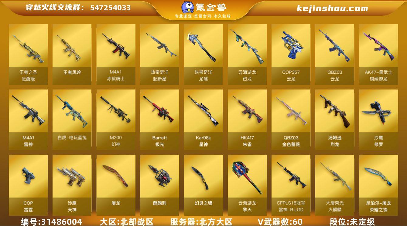 北方大区-64V-3王者-0炫金 【热门武器】:QBZ03-金色蔷薇,M14EBR-玄武,HK417-朱雀,M200-幻神,死亡之眼,白虎-电玩蓝兔,Kar98K-星神,汤姆逊-烈龙*2,5-炽火炎龙,雷神-小红,沙鹰-修罗,Knife-冠军之刃 【王者炫金武器】:王者凤吟 【音效卡】:Barrett-极光音效卡,Barrett-碧霄极光音效卡*2 【皮肤】:幻神-冠军之幻,幻神-宠儿-2021MVP,M200-幻神-N9-2022MVP,幻神-电流骇客 皮肤,金色蔷薇-纸灯龙皮肤,QBZ03-巅峰荣耀皮肤,雷神-R.LGD-CFPLS18冠军,火麒麟-大唐荣光,屠龙-荣耀之锋 【角色】:炫,鹰,战地猎狐,王者影豹,奇洋探员,云海玲珑,暗夜-X,北极狐-X,飞虎队-X,娟娟,兰-新年限定,灵狐者-X,灵狐者-职业经理,龙儿,麻雀,曼陀罗-X,萌儿,潘多拉-X,潜龙队-X,兔囡囡,维纳斯,新娜塔莎,雪莉杨,夜玫瑰-宠粉,樱-战斗天使,游珑儿 【人偶武器】:雷神-小红,5-炽火炎龙,AWM-灵狐-15周年嘉年华,迷你波特博士,夺魂,迷你牛牛,迷你生化手雷*2,生化手雷-机甲核心,深渊终结者手雷*2,灵狐娃娃手雷 【暴走生化】:死亡之眼 【挑战大师】:激光毁灭者III-白马银枪,试炼破坏者III 【英雄级武器】:M4A1-雷神,HK417-朱雀,M14EBR-玄武,QBZ03-云龙,黑武士-锦绣游龙,超新星-热带奇洋,QBZ03-金色蔷薇,王者之圣-觉醒版,白虎-电玩蓝兔,Barrett-极光,M200-幻神,Kar98K-星神,王者蔷薇-觉醒版,汤姆逊-烈龙*2,烈龙-云海游龙,沙鹰-修罗,沙鹰-天神,COP-雷霆,COP 357-云龙,屠龙,麒麟刺,幻灵之锋,擎天-云海游龙,龙啸-热带奇洋,高爆手雷-雷霆*5,高爆手雷-幻灵*2,高爆手雷-云龙*3,手雷-云海游龙,手雷-热带奇洋,闪光弹-雷霆*5,闪光弹-幻灵*2,闪光弹-云龙*3,烟雾弹-雷霆*6,烟雾弹-幻灵*2,烟雾弹-云龙*3,M4A1-赤狱骑士,Barrett-碧霄极光 【道具】:泡泡象背包