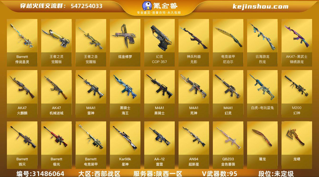 陕西一区-106V-7王者武器数-2炫金武器数 【传说武器】:传说圣灵 【热门武器】:传说圣灵,QBZ03-金色蔷薇,M200-幻神,死亡之眼,白虎-电玩蓝兔,柯尔特-冠军之特,Kar98K-星神,金色小号,C.A.T,毒蜂,M4A1-黑骑士,加特林-炼狱*2,COP 357-幻灵*2,Knife-冠军之刃,黄金猫猫手套-白鲨,金刚伞 【王者炫金武器】:炫金骑士,炫金修罗 【音效卡】:M4A1-黑骑士音效卡 【皮肤】:M200-幻神-黄忠皮肤,QBZ03-冠军之薇,雷神-暗月,雷神-耀金皮肤,M4A1-战神赵云,火麒麟-雷神,火麒麟-战神关羽,火麒麟-心动糖果,毁灭-冠军之怒*2,毁灭-战神张飞,毁灭-直播专属,黑骑士-战神马超,战神-粉色甜心皮肤*3,战神-紫绶金章皮肤*3,战神-流金岁月皮肤*5,修罗-能量核心 【角色】:樱,魅影,沙漠玫瑰,影豹,王者葵-惊若翩鸿,云海玲珑,暗夜-X,北极狐-X,初恋灵狐,芳心审判者,风暴女,嘉年华灵狐,灵狐-花神,龙儿-小淘气,麻雀,女主播,潘多拉-甜心教官,青霞仙子,斯沃特-X,铁骑荣耀,兔囡囡,新娜塔莎,游珑儿 【人偶武器】:天龙-曼陀罗,M4A1-雷神-精英刀锋,AWM-灵狐-15周年嘉年华,海滩汪汪-巴雷特,C.A.T,迷你深渊冰龙*2,迷你裂空之翼,迷你波特博士*5,迷你牛牛,迷你火种*2,生化手雷-机甲核心*2,深渊终结者手雷*2,迷你艾比,迷你超能女侍,灵狐娃娃手雷 【暴走生化】:毒蜂,黑龙吞噬者,双面神,死亡之眼 【挑战大师】:暴君乱世-超越Max,神圣爆裂者III,冰龙粉碎者-白马银枪*3,激光毁灭者III-白马银枪,VEPR-12-金魔,激光毁灭者III,机甲撕裂者III,试炼破坏者III,KAC-圣炎切割者III,神圣爆裂者-末日III,阐释者III 【英雄级武器】:AK47-火麒麟*2,M4A1-雷神,M4A1-黑骑士,M4A1-死神,AN94-超新星*2,AK47-机械迷城,M4A1-幻灵,无影-神兵利器,黑武士-锦绣游龙,QBZ03-金色蔷薇,王者...