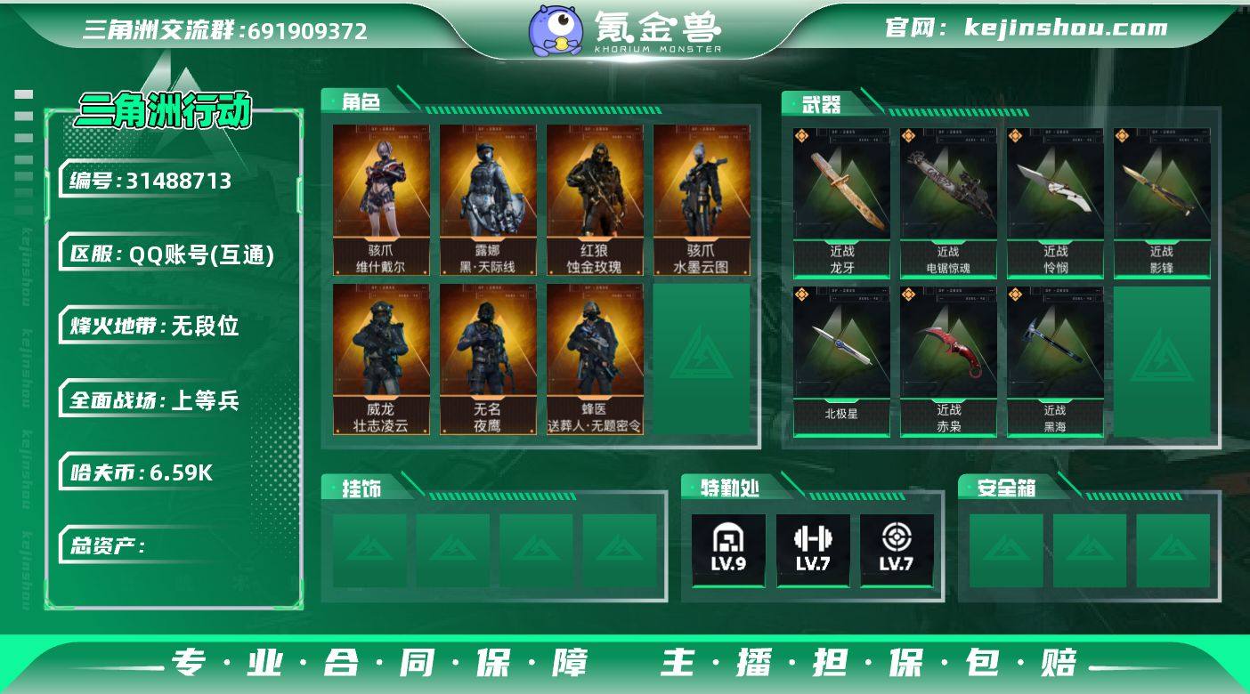 -满刀皮】【Q区三端互通】【无二次】z6376-特勤处:仓库9级/靶场7级/训练中心7级-总资产233.2m-哈夫币659w-烽火等级:60级 【干员外观】:红狼-蚀金玫瑰,骇爪-水墨云图,露娜-黑·天际线,蛊-能天使午夜邮差,骇爪-维什戴尔,威龙-壮志凌云,蜂医-送葬人·无题密令,无名-夜鹰,深蓝-不破誓约,红狼-电锯惊魂 【挂饰】:挂饰-能天使,挂饰-维什戴尔,挂饰-比利的面具,挂饰-影锋,挂饰-黑海,挂饰-北极星,挂饰-蚀金玫瑰,挂饰-黑,挂饰-磁吸炸弹,挂饰-信号破译器,挂饰-特斯拉线圈,挂饰-来点薯条,挂饰-晶石幻想,挂饰-无机神经元,挂饰-枪匠,挂饰-彩蛋,挂饰-小羊,挂饰-王牌座驾,挂饰-启程,挂饰-雄狮之盾*13,挂饰-乐队纪念*12,挂饰-阿萨拉徽章*15 【近战皮肤】:近战-赤枭,近战-怜悯,近战-影锋,近战-黑海,近战-北极星,近战-电锯惊魂,近战-信条,近战-龙牙,近战-黑鹰