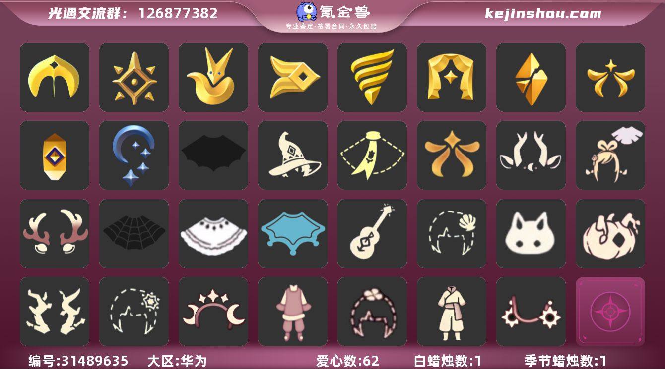 11季12翼圣诞鹿角蝙蝠斗透明蝶翼王子围巾周年抱枕青衫落拓巫师帽详情看图,价格可刀 资源:蜡烛 25 爱心 122 红烛 42 翼12 已毕业地图:全图毕业 毕业季节: 破晓季 欧若拉季 拾光季 归巢季 九色鹿季 二重奏季 姆明季 彩染季 青鸟季 迁徙季 筑巢季季卡 毕业季节物品: 双翼遥鲲斗篷 冥龙斗篷 留辨蘑菇头 高领舞服 透明蝶翼斗 粗框眼镜 季卡相机 西部帽 五塑彩羽发 五塑彩带斗 九色鹿丸子头 九色鹿丝带裤 九色鹿飞天斗篷 合奏挂画 蓝色燕尾服 白色高脚钢琴 姆明抱枕 姆明大伞 姆明长裙 彩染围巾斗篷 辉光羚羊面具 青鸟面饰 青鸟斗篷 蓝色毛绒绒鞋 蓝色毛绒裤子 海牛鹿角头饰 稀有礼包:王子围巾 蝙蝠斗 南瓜头 白雪斗篷 青衫落拓礼包 姆明饰品 皮皮猫套装 圣诞鹿角 彩虹耳机 九色鹿角 大耳狗头饰 心心相印 玉兔头饰 贝壳发夹 雪花发夹 大桔大利 月华霓裳套装 阔腿牛仔裤 优雅三件套 玉兔拖鞋 雪人暖靴 巫师帽 双马尾渐变发型 周年抱枕 水晶球 祥云纸伞 献瑞折扇礼包 花憩茶桌 狐狸背包 热门裤子:背带裤 鳐鲲长裙 绑带舞服 奔月长袍 妮妮长裙 海洋武士裤 白棉裤 武士裤 红色流珠裙 探险燕尾服 月华套装 阔腿牛仔 优雅三件套 玉兔拖鞋 雪人暖靴 热门面具:矮人面具 狐狸面具 黄鼠狼面具 红兔面具 一字眉 盲僧眼罩 向导面具 青鸟面具 龙头 玫瑰花面具 玫瑰面具 黑脸 粽叶面具 鸟羽面具 鹿角面具 热门发型:海草头 爆炸头 大胡子 小飞象 雨妈 卡卡 平菇 龙骨 指甲盖 箬笠 蝴蝶结 公主头 粗辫 水母头 正太 总裁 书虫 高马尾 明制帽 郡主头 斗笠 绿丝带 虚荣 圆环发辫 留辫蘑菇头 彩色脏辫 彩羽发型 兔子头 樱花头 鳐鲲发型 猫猫头女巫发型 光头 南瓜头 巫师...