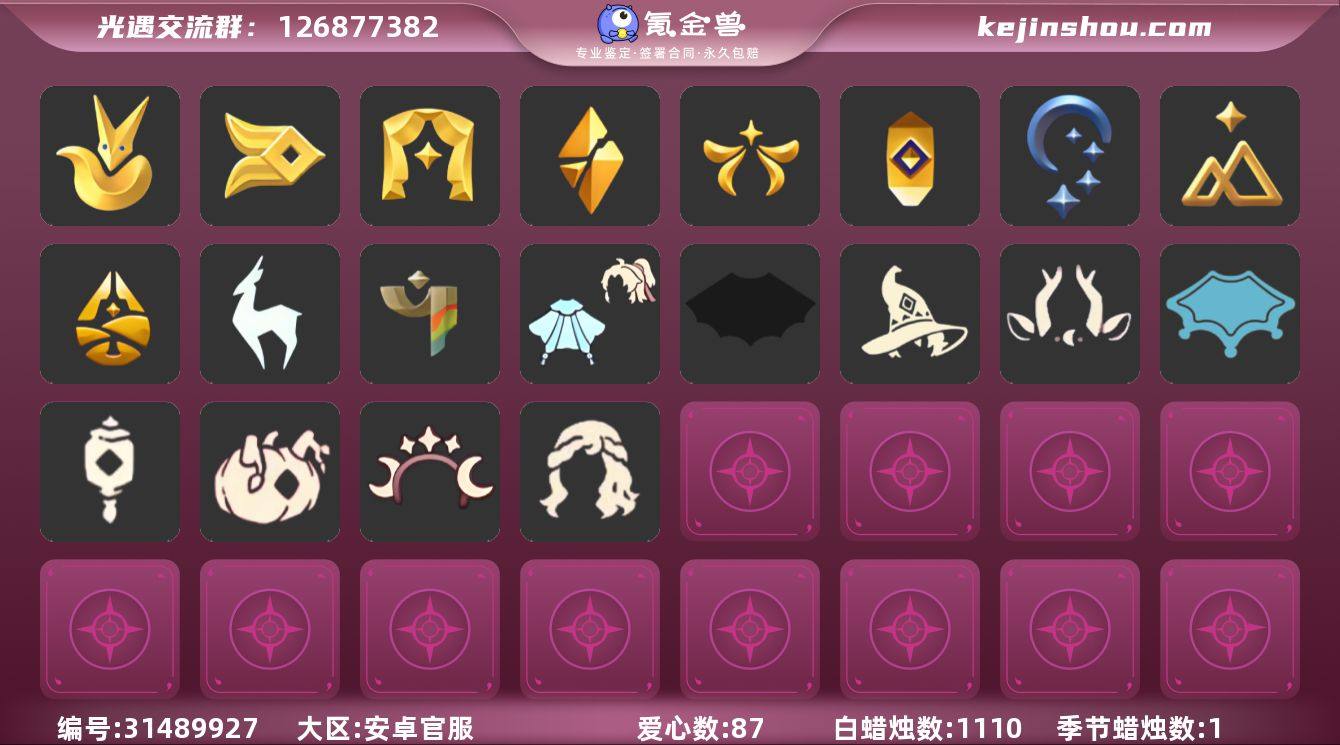 账号类型: 手机账号 季节已毕业: 小王子季,风行季,潜海季,表演季,破晓季,欧若拉季,夜行季,追忆季,拾光季,九色鹿季 完成地图: 雨林,霞谷 珍稀物品: 白枭,透明蝶翼斗,玫瑰花 礼包: 蝙蝠套,巫师,星球斗,欧若拉之翼,九色鹿角,莲花斗,绊爱,大铁头,鹿角,蜘蛛斗,牛仔裤,运动鞋,秋千,茶桌,茶壶,餐桌,白绒金,瑞雪,福娃,吉他,灯笼,人声乐器,橘子,贝壳,黄伞,红伞,兔子,枯角,雪花,竖琴,水母,星月头饰,彩虹耳钉,彩虹耳机,新年裤,蝴蝶结,魔法棒,四叶草,向日葵套,滑板,爱心眼镜,火焰眼镜,透明蛛丝,新年耳钉,创始人,蛛网朋克,献瑞折扇礼包 裤子: 武士裤,背带裤,搓澡巾,王子服,蓝绿裤,飞天裤 面具: 贴花面具,呼吸面具,夜行毕业面具,黄眉企鹅面具 面饰: 红耳机,黑框眼镜 项链: 围巾 发型: 归巢毕业发型,若笠,虚荣,单侧绑发,小王子发型,留辫蘑菇头,飞天盘发 头饰: 行军锅头盔,羽毛发饰,牛仔帽,蓝色音乐会,平顶帽 斗篷: 海洋斗,粉红绒毛斗篷,遥鲲斗篷,燕尾斗篷,冥龙斗篷 配饰: 雨伞,高音钢琴,相机,玫瑰花,鲲灯 亮点: 【优质装备】:表演季,白枭(帝企鹅发),武士裤,小王子季(王子季),风行季,潜海季,破晓季,透明蝶翼斗,欧若拉季(欧若拉),归巢毕业发型(五塑彩羽发),行军锅头盔(六边锅帽子)(双耳锅帽子),羽毛发饰(多羽发饰),高音钢琴(白色高脚钢琴),玫瑰花,夜行季,追忆季,牛仔帽(西部帽),相机(季卡相机),拾光季,九色鹿(九色鹿季),王子服(小王子套装),蓝绿裤(高领舞服),飞天裤(柔缎花边连)(九色鹿丝带裤),围巾(肩带),贴花面具(丛林黑面具),呼吸面具(潜水面具),夜行毕业面具(棕熊面具),黄眉企鹅面具,黑框眼镜(粗框眼镜),单侧绑发(单边小辫),小王子发型,留辫蘑菇头,粉红绒毛斗篷(绒毛斗篷),遥鲲斗篷(双翼遥鲲斗),燕尾斗篷,冥龙斗篷,鲲灯(追忆之书),飞天盘发(九色鹿丸子头),蝙蝠套(蝙蝠斗篷)(南瓜头),星球斗(星球夹克),欧若拉之翼,福娃(福娃礼包)...