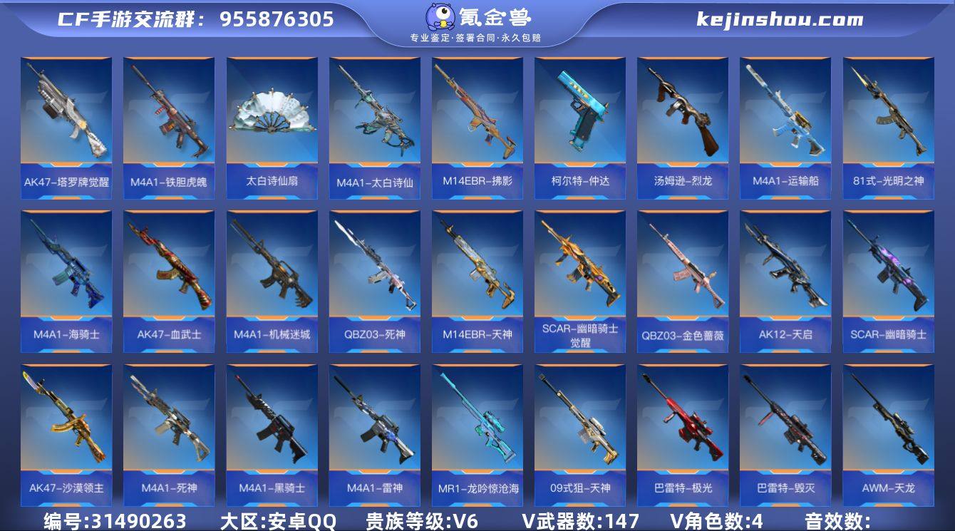 5英雄角色数-142英雄武器数 【王者系列】:王者之影,王者之心,王者之神,王者之迹,王者之魂,王者幻神,王者之霆 【热门武器】:81式-光明之神 【角色】:樱,关小雨*2,春节兰-X,钟小魁 【英雄武器】:AK47-沙漠领主*2,AK47-血武士,AK47-木兰,AK47-塔罗牌觉醒,AK47-谜城烟火,M4A1-雷神,M4A1-黑骑士,M4A1-死神*2,M4A1-机械迷城,M4A1-海骑士,M4A1-运输船,M4A1-千变,M4A1-太白诗仙,M4A1-铁胆虎魄,SCAR-幽暗骑士,SCAR-幽暗骑士觉醒,SCAR-探星者,M14EBR-天神,M14EBR-拂影,M14EBR-葫芦山庄,AK12-天启,QBZ03-金色蔷薇*4,QBZ03-死神,HK417-炎龙铠甲,81式-光明之神,G3A3-衍神兵*2,AWM-天龙,AWM-大湾溢彩,巴雷特-毁灭*2,巴雷特-极光,09式狙-天神,MR1-龙吟惊沧海,RPK-盘龙,RPK-美杜莎,加特林-堡垒,汤姆逊-烈龙,寒霜烈龙,双持斯泰尔-天使,地狱火,贝雷塔-力拔山河,M1887-幽冥玄喵觉醒,Origin12-机变奇蛇觉醒,USP-神罚,USP-机械迷城,USP-太白诗仙,USP-耀金伯爵,沙鹰-修罗*2,沙鹰-宇航兔兔,改装GLOCK-木兰,左轮-卧龙觉醒,GLOCK18-猎神,柯尔特-仲达,柯尔特-伏刹山海觉醒,女皇利刃-铁胆虎魄,龙啸,神罚战斧,手斧-机械迷城,屠龙*6,尼泊尔-火麒麟,穷奇铁扇,太白诗仙扇,星芒,马来剑-毁灭*2,唐刀-大唐荣耀,擎天