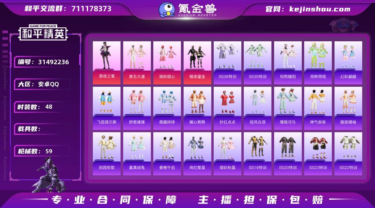 【和平精英】4粉装,5特效枪,0载具,历史最高段位:超级王牌4星 王牌印记3次 热力值:43753,119套装,142枪械,172装备,80战备;套装:套装-暗夜鎏金,套装-第五大道,套装-飒粉甜心,角色-罪夜之冕,套装-青年教官,套装-橘黑制服,套装-蓝色运动,套装-白色伏地魔,套装-黑色伏地魔,套装-冰川格斗者,套装-竞技名士,套装-湖蓝色名流,套装-黄色名流,套装-猛禽,套装-长空猛禽,套装-黎明保卫者,套装-冷焰舞者,套装-浪漫天命,套装-贵族骑装,套装-特殊使命,套装-青春校园,套装-甜蜜告白,套装-春日漫步,套装-龙腾端午,套装-幻影武者,套装-魅力单车,套装-绮丽涂鸦,套装-竞技达人朋克,套装-狂沙舞者,套装-破晓战魂,套装-都市魅力,套装-荣耀,套装-幻世战舞者,套装-暗影哥特,套装-青涩时光,套装-缤纷果语,套装-龙魂突击队,套装-冰川特警,套装-麻辣教官,套装-破蛋小黄鸡,套装-疯狂小兔子,套装-霓虹街区,套装-白熊同盟,套装-萌黄之夏,套装-夏日音浪,套装-探宝勇士,套装-牛气满满,套装-白糯汤圆,套装-战术大师,套装-牛气冲天,套装-飞行日记,套装-吉莉礼服,套装-SS19特训,套装-炫蓝之夏,套装-SS20特训,套装-SS21特训,套装-暖心熊熊,套装-萌趣咩咩,套装-娇憨猪猪,套装-荷畔雨呱,套装-酸甜橘柚,套装-玉兔迎春,套装-SS22特训,套装-和煦暖阳,套装-田园牧歌,套装-轻风白浪,套装-绚烂繁星,套装-熠彩粉晶,套装-光之冒险,套装-绯格组合,套装-SS23特训,套装-飞狐塔尔斯,套装-莱茵河畔,套装-香榭午后,套装-神气柴柴,套装-懵萌河马,套装-妙红点点,套装-幻彩翩翩,套装-王牌教练,套装-柠萌假日,套装-SS24特训,套装-源星混沌,套装-龟仙人,套装-涂山之恋,套装-SS25特训,套装-龙的传人,套装-SS26特训,套装-空岛之星,套装-童真绒兔,套装-云魄琉璃,套装-SS27...