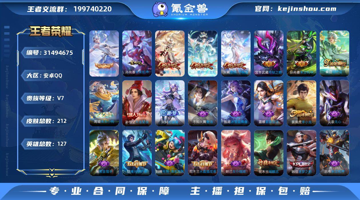 安卓Q-V7-最强王者段位-127英雄-212皮肤-1典藏皮肤-6传说-48史诗 【英雄全皮】:影全皮 【荣耀典藏】:伽罗最初的交响 【传说皮肤】:女娲愿照千秋盛,妲己愿照众生和,澜愿照九州拓,桑启鸣野蒿,孙尚香末日机甲,宫本武藏地狱之眼 【限定皮肤】:白起狰,姜子牙天穹之誓,杨戬破阵退雄兵,狄仁杰阴阳师,虞姬凯尔特女王,赵云皇家上将,嬴政白昼王子,孙尚香蔷薇恋人,鲁班七号狮舞东方,庄周蜃楼王,庄周玄嵩,孙膑妖精王,扁鹊炼金王,芈月重明,吕布猎兽之王,元歌无心,曹操烛龙,典韦穷奇,狄仁杰魔术师,狄仁杰万华元夜,达摩沙漠行僧,项羽海滩派对,老夫子醍醐杖,程咬金演武夺筹,韩信逐梦之影,兰陵王金庭之子,花木兰瑞麟志,孙悟空大圣娶亲,牛魔御旌,李元芳云中旅人,钟馗神迹守卫,钟馗驱傩正仪,杨玉环遇见飞天,太乙真人饕餮,鬼谷子原初探秘者,苏烈千军破阵,百里玄策原初追逐者,弈星混沌棋,明世隐疑决卦,裴擒虎李小龙,裴擒虎擒涛扼浪,狂铁御狮,米莱狄御霄,盾山御銮,鲁班大师探海日志,桑启海盐诗旅,张良古海寻踪,鬼谷子天穹祈灯,刘邦剑破天穹,程咬金群星魔术团,镜青焰无极,项羽苍威无极 【年限皮肤】:花木兰瑞麟志,庄周玄嵩,女娲愿照千秋盛,妲己愿照众生和,澜愿照九州拓 【赛季限定】:庄周蜃楼王,孙膑妖精王,扁鹊炼金王,虞姬凯尔特女王,白起狰,太乙真人饕餮,曹操烛龙,芈月重明,典韦穷奇,狂铁御狮,米莱狄御霄,牛魔御旌,盾山御銮,弈星混沌棋,明世隐疑决卦,老夫子醍醐杖,鬼谷子原初探秘者,狄仁杰万华元夜,程咬金演武夺筹,钟馗驱傩正仪,苏烈千军破阵,达摩沙漠行僧,兰陵王金庭之子,李元芳云中旅人,桑启海盐诗旅,裴擒虎擒涛扼浪,鲁班大师探海日志,张良古海寻踪,鬼谷子天穹祈灯,刘邦剑破天穹,姜子牙天穹之誓,东皇太一噬灭天穹,亚瑟荣光之誓,...