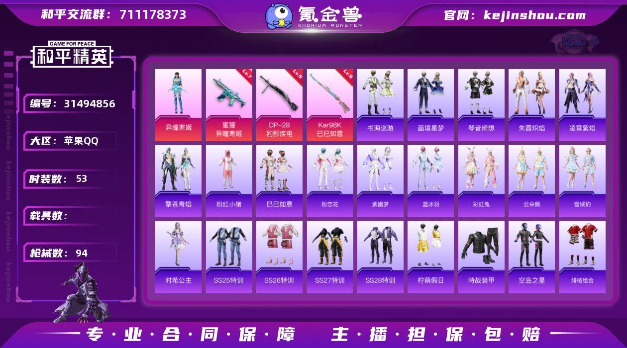DSH2313苹果手Q-3粉装-5特效枪-78套装-113枪皮-3王牌印记-不朽星钻Ⅰ-31579热力值【3粉装】幻彩电音,星之彼岸,角色-羊梦糖心【5特效枪】Kar98K-巳巳如意[5级],ACE32-萌骑漫游[3级],DP-28-豹影疾电[5级],Mk14-福马献瑞[5级],蜜獾-异瞳寒姬[6级]【4稀有】激萌罗小黑,浪漫天命,STE战队服,忍者信条【5飞行器】炫彩糖果飞行器,破刃行动尾迹,登顶巅峰飞行器,异域银装飞行器,鸡智如我飞行器【179其它衣服和枪皮】角色-蜜桃派对,白色伏地魔,火种守卫者,角色-紫俏灵猫,鱼渊荷华,冷焰舞者,蝶变,午间小调,角色-许七安,SS36特训,错位像素,巳巳如意,街头潮人,白糯汤圆,SS34特训,燕燕于飞,龙魂突击队,角色-绯色魅影,SS37特训,玲珑飞花,智谋强哥,薄荷星砂,青涩时光,竞技达人朋克,蓝色运动,森林游猎者,耀粉歌者,海岛探路者,旭日情侣,恋语绒绒,冰冻风暴,缤纷果语,东方飞龙,大橘大利,角色-狂花道·雅典娜,星渊小夜曲,元素星魂,魅力单车,朱霞炽焰,黄色运动,紫幽梦,顶瓜瓜,糖糖葫芦,街头风暴,黄色伏地魔,福马献瑞,SS29特训,SS30特训,萝兰蝴蝶,风迹短诗,云魄琉璃,战术大师,炫彩糖果,SS31特训,蓝冰羽,元气之梦,冰河战士,雏菊兔兔,粉黛兰香,漫步者,SS32特训,雪国风尚,王牌教练,SS33特训,青团波波,星途旅人,SS35特训,萌鸡速递,马上有钱,凌霄紫焰,狙击之神,破片手榴弹-拽到爆炸,SPAS-12-狂鲨锋刃,ACE32-钛晶裂爪,AUG-冰晶雪宝,蜜獾-糖糖葫芦,12-风迹短诗,R45-幻彩电音,S12K-夜灯,汤姆逊-幻影战神,M249-无面战甲,平底锅-凌霄紫焰,AC-VAL-荒原烈焰,SVD-霓彩脉冲,野牛-燕燕于飞,平底锅-紫幽梦,20-H-糖糖葫芦,PKM-紫幽梦,ACE32-冰晶雪宝,SLR-霓彩脉冲,S12K-玩趣呆呆,M200-六号稻草人,F57-魔童闹海 敖闰,Mk14-紫幽梦,野牛-雏菊兔兔,M249-星之彼岸,P90-巳巳如意,蜜獾-风迹短诗,Mini14