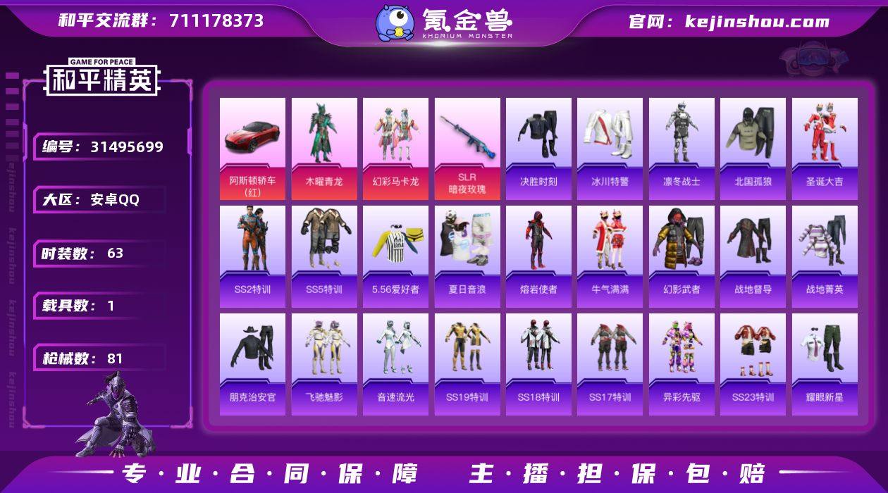 素材号 1币车 都市漫游者 老六服 可改实名 2粉1枪1载具63套装81枪皮 阿斯顿马丁红幻彩马卡龙 木曜青龙 雪山精英 福星高照 飞驰魅影 音速流光 异彩先驱 科技之星 牛气满满 青龙圣者 5级SLR-暗夜玫瑰 王牌印记4 热力值24412 和平精英买号包赔带二次营地ID:731671071 连体王者荣耀 可改实名 37皮3传说 无双飞将 淬星耀世 李逍遥 李小龙 繁星吟游 幽灵船长 魅力维加斯 地狱岩魂 鹰眼统帅 K31193 王者买号永久包赔 连体号