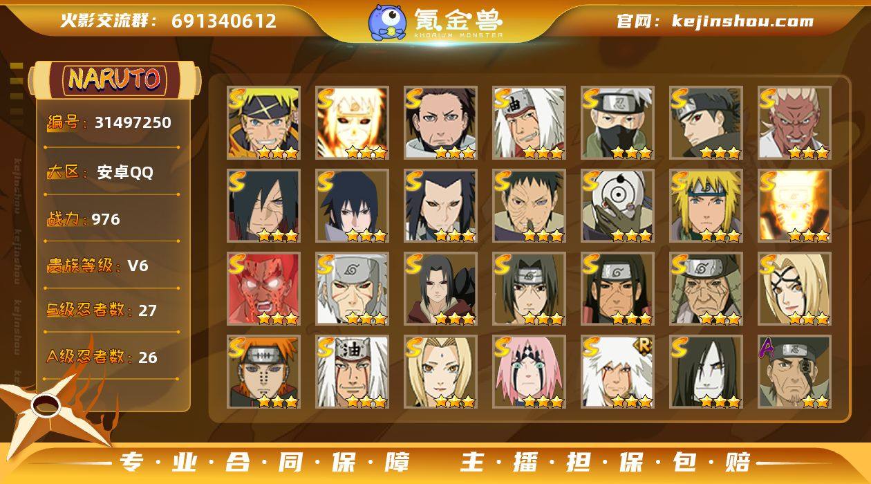 0B27PD 号 VIP6,976W战力,S忍28个,A忍30个,本服排名346,战区排名未上榜,通灵兽18个,8时装,点券130,金币13613,高招券34,暗部1阶,忍者星数463