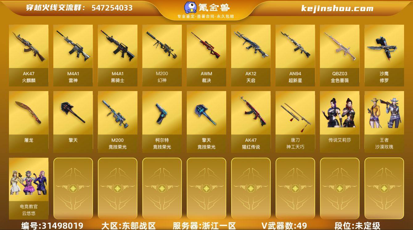 [15658701]9859/东部/浙江一区/【荣耀之巅24豆】/Lv.102 荣耀元帅/VIP6/49V/【四防传说】/传说艾丽莎/传说辉光/幻神/幻神黄忠/M200竞技荣光套/【QBZ三件套】/QBZ金色蔷薇/QBZ金色蔷薇音效卡/QBZ冠军之薇/柯尔特竞技荣光/COP雷霆/USP神工天巧/*2/3修罗/裁决/裁决胜者为王/裁决运输船/火麒麟/火麒麟大唐荣光/六套神工天巧雷/【四防角色】/电竞教官云悠悠/王者沙漠玫瑰/【道具】/永久烟雾头/护目镜/各种戒指/各种光效/各种玩偶/永久AC/永久雷包/细节看图/【此账号未被封过十年】