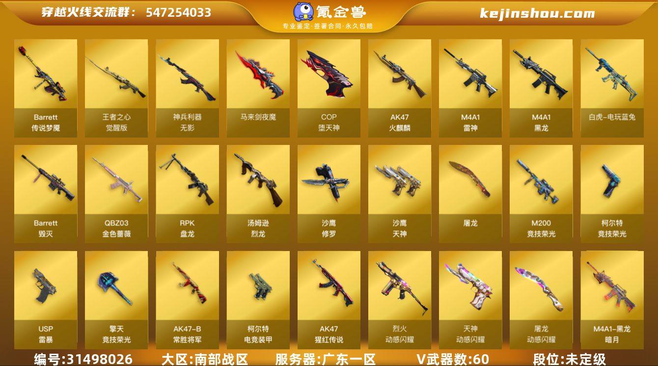 广东一区-66V-4王者武器数-0炫金武器数 【传说武器】:传说梦魇 【热门武器】:传说梦魇,QBZ03-金色蔷薇,M200-竞技荣光,白虎-电玩蓝兔,炼狱-迷你小钢,汤姆逊-烈龙*6,RPK-盘龙*2,加特林-炼狱,斯泰尔-蝴蝶,USP-雷暴,COP-堕天神*2,沙鹰-修罗 【音效卡】:Barrett-毁灭音效卡 【皮肤】:雷神-宇航兔皮肤,雷神-维纳斯皮肤,火麒麟-心动糖果,黑龙-暗月,战神-流金岁月皮肤,AK47-B-常胜将军-曹操,AK47-B-常胜将军-孙权,炼狱-玩具枪皮肤,修罗-星空 【角色】:电竞教官-云悠悠,乔伊教练,初恋灵狐,飞虎队-X,嘉年华灵狐,葵-赛博朋克,兰妹妹,灵狐者-黄金海岸,龙儿-小淘气,曼陀罗-礼服,潘多拉-X,潘多拉-甜心教官,斯沃特-X,蜀雪,兔囡囡,夜玫瑰-幻能朋克,樱-战斗天使 【人偶武器】:炼狱-迷你小钢,斯泰尔-蝴蝶,AWM-灵狐-15周年嘉年华,夺魂,深渊终结者手雷*2,迷你超能女侍 【暴走生化】:超级对讲机 【挑战大师】:冰龙粉碎者-白马银枪*2,VEPR-12-金魔,神圣爆裂者-末日III 【英雄级武器】:AK47-火麒麟,M4A1-黑龙*2,M4A1-雷神,无影-神兵利器,QBZ03-金色蔷薇,烈火-动感闪耀,王者之心-觉醒版,AK-47-猩红传说,王者冰魄-觉醒版,AK47-B-常胜将军,王者之烈-觉醒版,白虎-电玩蓝兔,Barrett-毁灭,M200-竞技荣光,RPK-盘龙*2,加特林-炼狱,悦蓝-惊涛骇浪-觉醒版,汤姆逊-烈龙*6,沙鹰-修罗,沙鹰-天神,USP-雷暴,COP-堕天神*2,柯尔特-电竞装甲,柯尔特-竞技荣光,天神-动感闪耀,屠龙,马来剑-夜魔,擎天-竞技荣光*3,屠龙-动感闪耀,高爆手雷-夜魔*3,高爆手雷-竞技荣光*4,手雷-动感闪耀,闪光弹-夜魔*3,闪光弹-竞技荣光*5,烟雾弹-夜魔*3,烟雾弹-竞技荣光*4 【道具】:冰冰企鹅背包,炫彩背包,女皇终结者-魔龙之吻,绿色巨人,灵魂忍者,变异宝贝,迷雾幽灵,夺命之镰,防化...