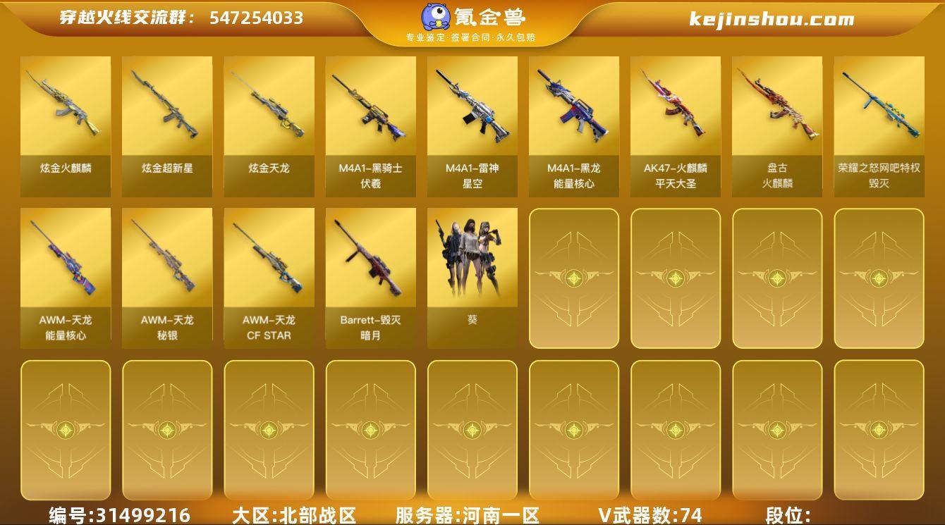 河南一区-48V-6王者武器数-0炫金武器数 【热门武器】:QBZ03-金色蔷薇,HK417-朱雀,M200-幻神,牛牛-AK47,M4A1-黑骑士,汤姆逊-烈龙*5,加特林-炼狱*2,斯泰尔-蝴蝶,沙鹰-修罗*3 【音效卡】:M200-幻神音效卡,M4A1-黑骑士音效卡,QBZ03-金色蔷薇音效卡 【皮肤】:幻神-丹凤,Scar Light-白虎-暗星,雷神-烈虎皮肤,火麒麟-雷神,毁灭-黑大圣皮肤,AK47-B-常胜将军-曹操,AK47-B-常胜将军-刘备,AK47-B-常胜将军-孙权 【角色】:雨棠,影豹,王者凌霄,王者玲珑-小乔,暗夜-X,初恋灵狐,芳心审判者,风暴女,虎妞,龙儿-小淘气,蜀雪 【人偶武器】:斯泰尔-蝴蝶,牛牛-AK47,夺魂,生化手雷-机甲核心,闪光弹-小乔,闪光弹-貂蝉,高爆手雷-大乔,迷你超能女侍 【挑战大师】:冰龙粉碎者-白马银枪*2 【英雄级武器】:AK47-火麒麟,M4A1-雷神,M4A1-黑骑士,AN94-超新星,HK417-朱雀,QBZ03-金色蔷薇,9A91-烈火,AK-47-猩红传说,AK47-B-常胜将军,机械迷城-穹宇,Barrett-毁灭*2,M200-幻神,王者星神-觉醒版,加特林-炼狱*2,汤姆逊-烈龙*5,沙鹰-修罗*3,沙鹰-天神,柯尔特-竞技荣光,屠龙,擎天,擎天-竞技荣光,王者之啸-觉醒版*3,高爆手雷-幻灵*5,高爆手雷-雷霆王者-觉醒版,闪光弹-幻灵,烟雾弹-幻灵*2 【道具】:超级背包,女皇终结者-魔龙之吻,夺命之镰,防化服,枪王排位28赛季金色流光,枪王排位29赛季金色流光,电玩兔兔表情,防弹头盔,防弹衣,C4工具钳,手雷包 【特殊枪械】:蝴蝶斯泰尔+5烈龙,1黑骑士,5烈龙,2炼狱,1蝴蝶斯泰尔