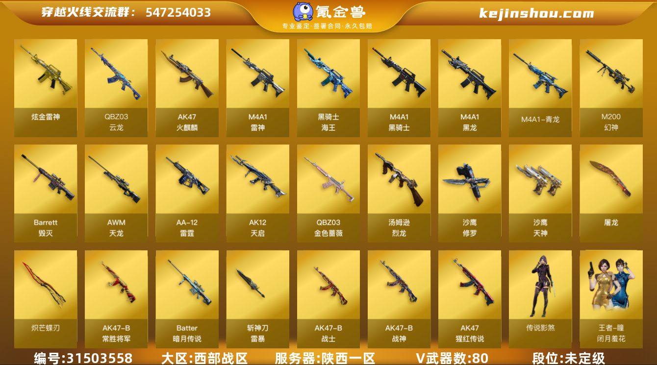 11031/西部/陕西一区/钱包注销/可排位/可二次/掌火ID:232239776/80V/【幻神三件套】/传说影煞/四防/幻神/幻神音效卡/幻神宠儿/幻神N92022VMP/炽芒蝶刃/雷霆套/QBZ金色蔷薇/王者凤吟/青龙/玄武/天龙/毁灭/黑骑士/雷神/火麒麟/QBZ云龙/【四防已开】/王者魅影/【音效卡】/黑骑士音效卡/毁灭音效卡/永久AC/细节看图
