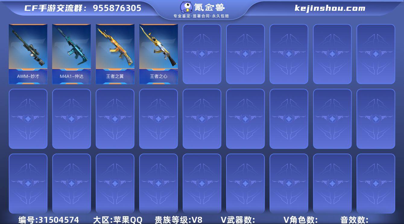 ABC11207/苹果QQ/贵8/可转区/钱包注销/可二次/199V不重复/39角色/413万化/1至尊/1同框/24王者武器/心至尊/仲达套/白露/烽火连城/妙才套/幻神套/81式光明之神/王者之势/冰霜奇迹/王者之心/王者之影/王者之翼/王者之烈/M12S雷霆王者/王者之兽/王者之尊/王者之魂/白金血钻/王者之锋/王者之心手雷套/王者之兽手雷套/王者之影闪光弹/王者之翼闪光弹/【角色】/月神X/关小雨/炽天使X/零新生/火麒麟套/毁灭套/冰锋套/火力竞放套/木兰套/神工天巧套/诗仙套/毒蜂套/天神套