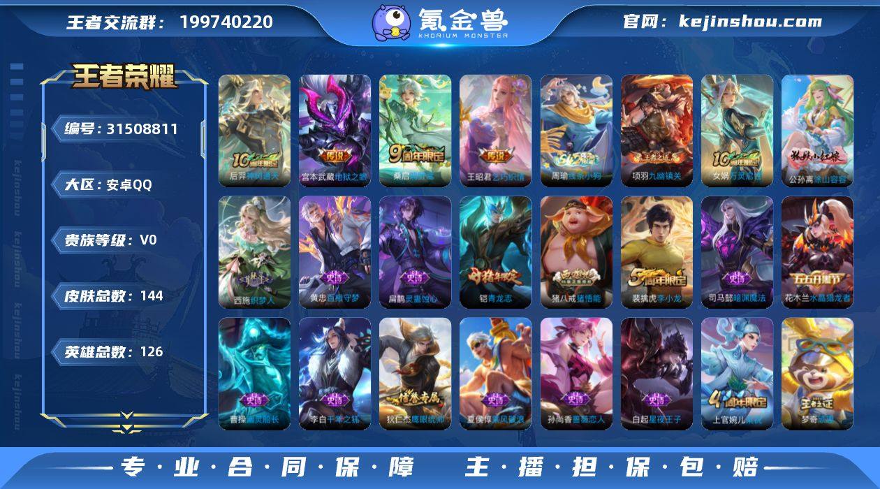 不常玩了,以前玩的一个号,皮肤一些年限,还有个 青龙志,铭文满级英雄 除了那几个付费的,其他的都有