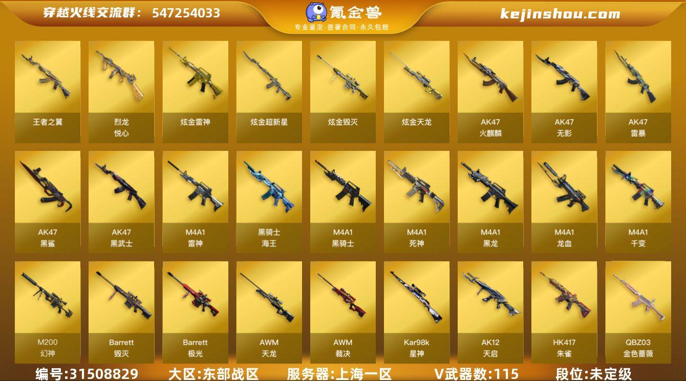 上海一区-41V-4王者-3炫金 【传说角色】:传说星骇 【热门武器】:QBZ03-金色蔷薇,M4A1-黑骑士,汤姆逊-烈龙*6,RPK-盘龙,加特林-炼狱,降世魔童,沙鹰-修罗*4 【王者炫金武器】:王者之怒,炫金黑龙,炫金雷神,炫金修罗 【音效卡】:M4A1-雷神音效卡,Barrett-毁灭音效卡 【皮肤】:裁决-羽掣 皮肤,雷神-暗月,雷神-机甲刑天皮肤,火麒麟-轻羽皮肤,毁灭-暗月,毁灭-CFS2020,毁灭-神秘黑洞皮肤,黑龙-暗月,黑骑士-暗月,黑骑士耀金皮肤,死神-秘银,天启-暗月*3,天龙-能量核心,极光-能量核心,炼狱-奇幻宇宙万象,修罗-能量核心 【角色】:零,葵,樱,乔伊教练,云海玲珑,炽天使,北极狐-X,初恋灵狐,芳心审判者,风暴女*2,零-水下丽影,灵狐者-黄金海岸,曼陀罗-X,萌儿,潘多拉-甜心教官,邱刚敖,青霞仙子,斯沃特-X,蜀雪,铁骑-乘风破浪,铁骑荣耀,兔囡囡,维纳斯,新娜塔莎,雪莉杨,影武者-X,智影 【人偶武器】:火麒麟-灵狐,巴雷特-零-水下丽影,M37-葵,迷你深渊冰龙,夺魂*2,迷你生化手雷,深渊终结者手雷,迷你艾比,迷你巨石泰坦-魔花研究所,降世魔童 【挑战大师】:火狱乱世-超越Max,AK47-冰龙粉碎者,激光毁灭者III,KAC-圣炎切割者III,神圣爆裂者-末日III,阐释者III 【英雄级武器】:AK47-火麒麟,M4A1-雷神,M4A1-黑骑士,AN94-超新星,M4A1-武圣,AK47-黑鲨,M4A1-玫瑰精灵,QBZ03-金色蔷薇,王者之心-觉醒版,AK-47-猩红传说,黑骑士-海王,AWM-天龙*2,Barrett-毁灭,Barrett-极光,AWM-裁决,Barrett-金色蔷薇,RPK-盘龙,加特林-炼狱,汤姆逊-烈龙*6,沙鹰-修罗*4,沙鹰-天神,王者之灵-觉醒版,屠龙*2,龙啸,擎天,麒麟刺,王者之啸-觉醒版,高爆手雷-雷霆,闪光弹-雷霆,烟雾弹-雷霆 【道具】:亚洲杯纪念炫彩背包,炫彩背包-诺拉,炫彩背包,老虎背包,背包-葫芦兄...