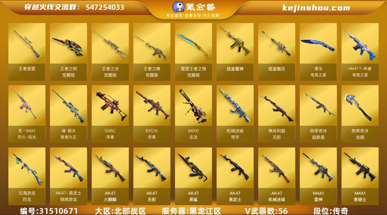 【自带包赔 最高三倍】:北部战区:黑龙江区-LV102-荣耀元帅-传奇2-V56-5王者-2炫金 【特殊武器】: RPK-盘龙, 汤姆逊-烈龙 【热门武器】: M200-幻神, M200-竞技荣光, QBZ03-金色蔷薇, AWM-裁决, 白虎-电玩蓝兔 【音效道具】: M200-幻神音效卡, M4A1-黑骑士音效卡, Barrett-极光音效卡 【武器皮肤】: 幻神-纸灯龙皮肤, 极光-能量核心, 毁灭-墨兰皮肤, 雷神-维纳斯皮肤, 雷神-源计划2.0专属 皮肤, 火麒麟-雷神, 火麒麟-百城, 火麒麟-心动糖果, 黑骑士-地狱火, 黑骑士-摸金校尉, 黑骑士-少林, 黑骑士-破浪10年皮肤, 死神-机甲核心皮肤, 毁灭-黑大圣皮肤, 火麒麟-CFSTAR, 修罗-能量核心, 黑龙-能量核心, 屠龙-秘银, 修罗-CFSTAR, 金色蔷薇-电竞之星 皮肤, 毁灭-英雄计划 皮肤 【炫金王者】: 炫金毁灭, 炫金雷神, 王者霜心, 王者星霆, 王者之魄-觉醒版, 王者之决-觉醒版, 王者之刺-觉醒版 【英雄角色】: 樱, 王者-瞳-闭月羞花, 乔伊教练, 隼(四防), 王者炫(四防), 奇洋探员, 云海玲珑 【人偶武器】: AWM-灵狐-15周年嘉年华, 巴雷特-零-水下丽影 【账号概览】: M200-幻神, M200-竞技荣光, QBZ03-金色蔷薇, AWM-裁决, 白虎-电玩蓝兔, 炫金雷神, 炫金毁灭, 王者星霆, 王者霜心, 无影-神兵利器, 屠龙-云海游龙, 屠龙-动感闪耀, 屠龙, 天神-动感闪耀, 汤姆逊-烈龙, 沙鹰-修罗, 沙鹰-天神, 擎天-云海游龙, 擎天-竞技荣光, 擎天, 麒麟刺, 龙啸-热带奇洋, 龙啸-烈火龙威, 龙啸, 烈龙-云海游龙, 烈火-动感闪耀, 加特林-炼狱, 黑武士-锦绣游龙, 超新星-热带奇洋, RPK-盘龙, M4A1-千变, M4A1-雷神, M4A1-黑骑士, M4A1-黑龙, Barrett-极光, Barrett-毁灭, Barrett-暗月传说, AWM-天龙, AN94-超新星, AK47-无影, AK47-机械迷城, AK47-火麒麟, AK47-黑武士, AK47-黑鲨, 巡航者, 雷霆王者之锋-觉醒版, 幻神-纸灯龙皮肤, 火...