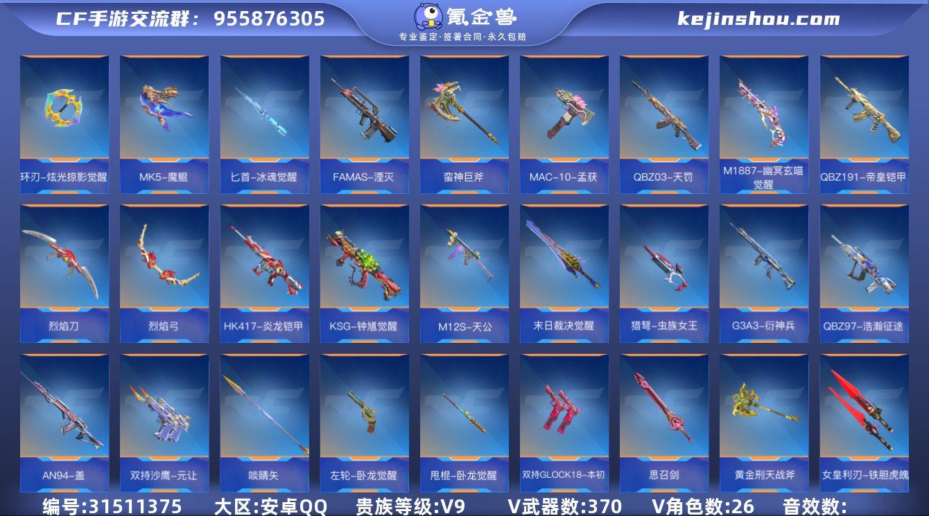 【FC-15NN6C】【5至尊2同框-28王者7套王雷多三国套】安卓QQ,成人号:是,角色等级:167,实名:有修改人脸机会/实名是本人,段位:枪皇SS,VIP等级:V9,V武器数量:546,V角色数量:26,V总数量:370,王者武器数:23,万化数量:735,音效皮肤数:22, 【人物角色】晴雅,云悠悠,蝴蝶,关小雨,瞳,潜龙队,樱,幽灵刀锋-觉醒,堕天使,复仇者,葵,萝拉,零,审判者,幻影,灵狐者,斯沃特,零-新生,步练师,虹儿,刀锋-枪战王者,炽天使-X,云悠悠-心动起点,木兰,雅典娜,变装舞会兰,零-水下丽影,斯薇特-X,妲姬,职场灵狐,职场灵狐-赛事经理,春, 【王者武器】王者之誉,王者之霆,王者之业,王者之尊,王者之兽,王者之魄-冠军珍藏,王者之蝶,王者之心,王者之影,王者之翼,王者之势,王者之戮,王者之怒,王者之魂,王者之轮,王者之电,王者之锋,王者之啸,王者之刺,王者之烈,王者之迹,王者之神,王者之狱, 【至尊套装】势至尊,怒至尊,心至尊,魄至尊,神至尊, 【带V枪械】尼泊尔-星象,龙啸,巴雷特-毁灭,尼泊尔-火麒麟,地狱烈炎,丈八蛇矛,剑齿虎,马来剑-毁灭,麒麟刺,柯尔特-仲达,尼泊尔-竞界荣光,SCAR-探星者,AK47-无影-葵,尼泊尔-铜头铁臂,M4A...