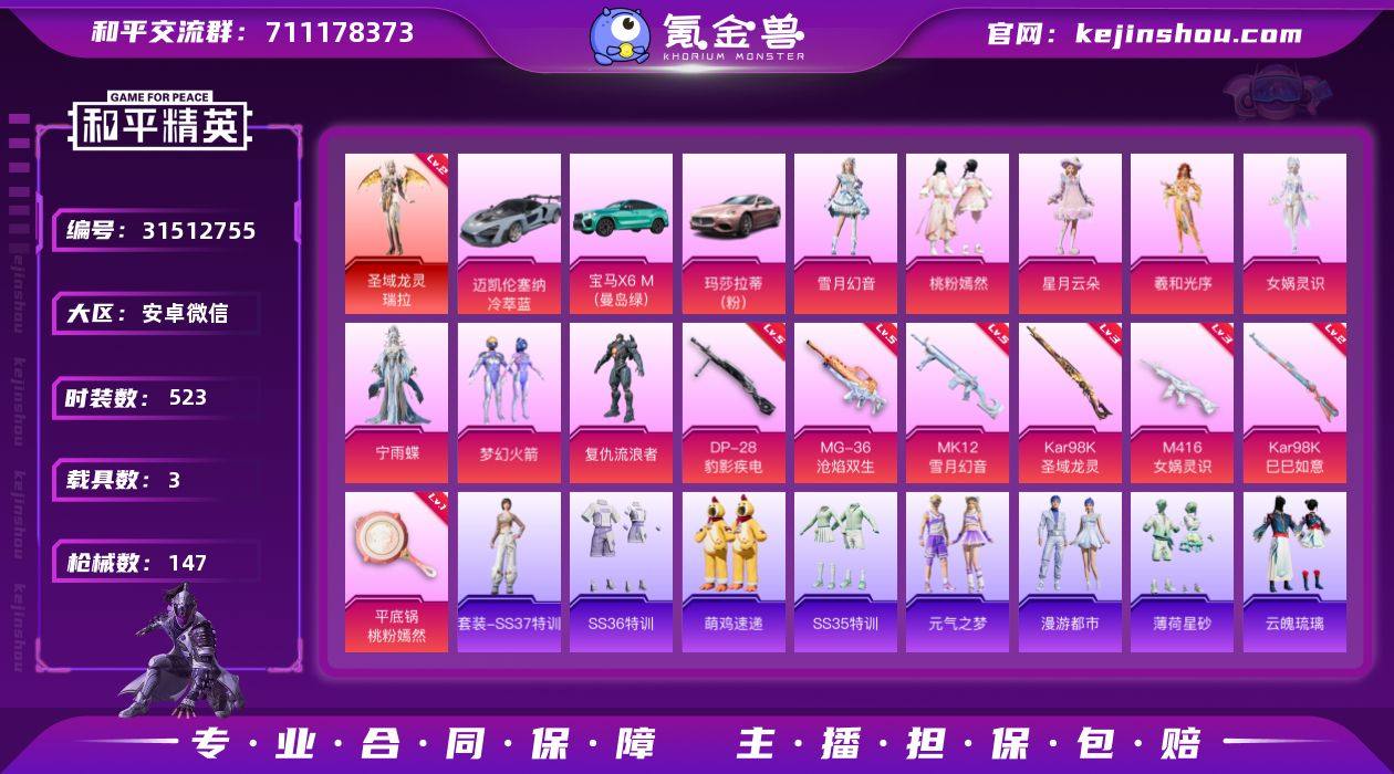 安卓【素材号 怪诞乔克/梦幻火箭/都市猎人/暗影哥特/蓝螳螂/M416-电玩时刻(五级)/AUG-暖羊咩咩(五级)/】 手Q-无敌战神框-7粉装-10特效枪-3载具-3粉色飞行器-60260热力值-11王牌印记-132套装-194枪皮 【热门品类】:粉装-怪诞乔克,粉装-梦幻火箭,套装-浪漫天命,套装-都市猎人,套装-深海小丑鱼,套装-奇异狩猎者,套装-忍者信条,套装-潮萌小黄鸭,套装-暗影哥特,角色-8号机,角色-Mark.06,套装-红熊茄茄 【粉色套装】:粉装-幻影战神,粉装-怪诞乔克,粉装-梦幻火箭,粉装-金丰海韵,粉装-星穹咏叹调,角色-星渊,粉装-极意拳锋 【粉色枪皮等级】:M416-电玩时刻(五级),GROZA-镜光银凌(五级),AUG-暖羊咩咩(五级),UMP45-量子极限(五级),AKS-74U-无垠阁(三级),Kar98K-巳巳如意(五级),Mk14-樱桃泡泡(六级),M249-彩虹甜喵(七级),DP-28-豹影疾电(五级),燃烧瓶-薄荷可可(六级) 【粉色载具】:路特斯ELETRE(冰川蓝),保时捷Panamera(梦幻青),僚机-萌兔起飞,冰绡玉鳞 【粉色枪皮】:M416-电玩时刻,GROZA-镜光银凌,AUG-暖羊咩咩,UMP45-量子极限,AKS-74U-无垠阁,Kar98K-巳巳如意,Mk14-樱桃泡泡,M249-彩虹甜喵,DP-28-豹影疾电,燃烧瓶-薄荷可可 【粉色飞行器】:炫彩糖果飞行器,灵珠游龙飞行器 【粉色降落伞】:梦幻火箭降落伞,翩跹演武降落伞,旋转彩虹降落伞,黄族统领降落伞,闲梦青缨降落伞,电糖天使降落伞,初号机 觉醒Ver.降落伞,金丰海韵降落伞,赛博古神降落伞,无垠阁降落伞,魔童闹海 敖丙降落伞,极意拳锋降落伞,炫彩糖果降落伞 【稀有套装】:套装-巳巳如意,套装-雪国风尚,套装-炫彩糖果,套装-雏菊兔兔,套装-萝兰蝴蝶,角色-拉斐尔,角色-摩登魅猫,角色-俏兔智灵,套装-燕燕于飞,套装-鱼渊荷华,套装-星影赞美诗,套装-彩虹兔,套装-云朵鹅,套装-雪绒豹,套装-朱霞炽焰...