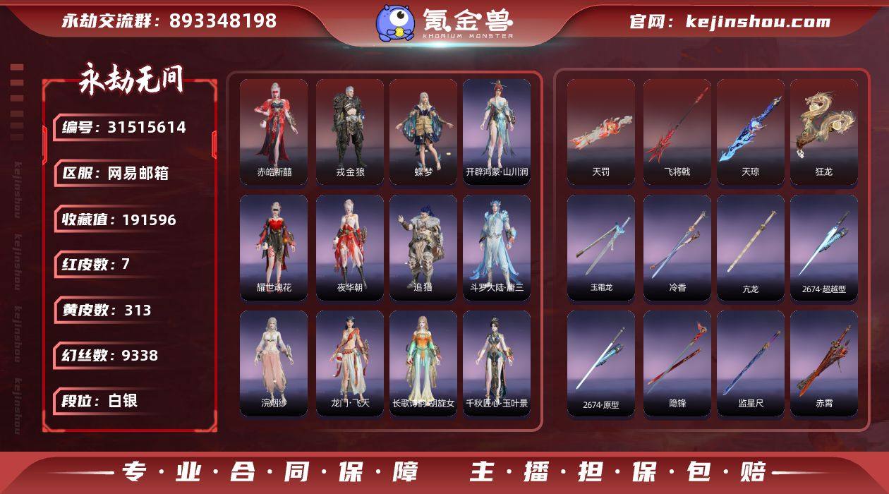 红皮数: 4 金皮数量: 138 版本: 标准版 神识(征神)等级: 680 英雄外观数: 471 武器外观数: 151 等级: 195 幻丝数: 4579 通行证: 未升级 征神通行证: 已升级 征神通行证等级: 143 亮点(征神号可备注): 7合道2化气1火正 神品及战旗皮: 戎金狼(特木尔皮肤),蝶梦(胡桃皮肤),狂龙(双节棍皮肤),天罚(火炮皮肤)
