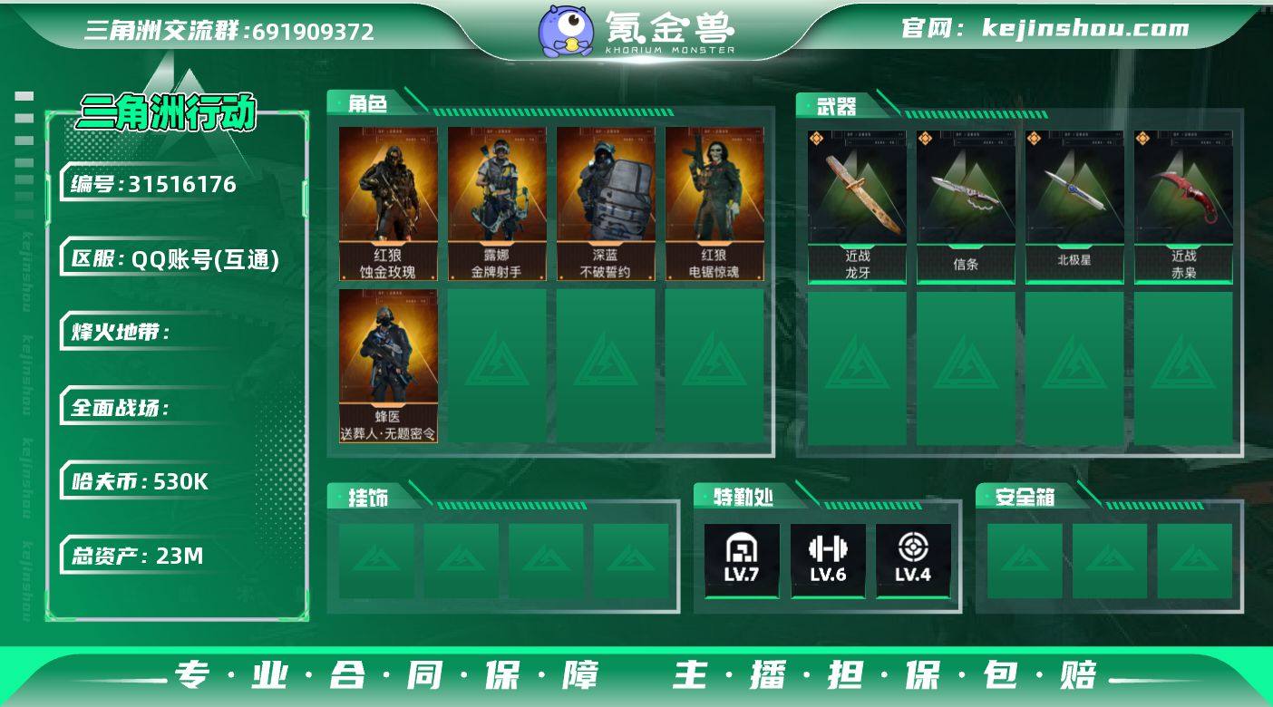 S1150总资产23M,哈夫币53w,近战5 枪皮数量178,红狼-蚀金玫瑰/露娜-金牌射手/红狼-电锯惊魂/深蓝-不破誓约/蜂医-送葬人无题密令,近战-龙牙/近战-信条/近战-北极星/近战-赤枭,战场等级13军士长, 行动等级60钻石,安全箱等时效性道具请以游戏内数据为准,详情请看图