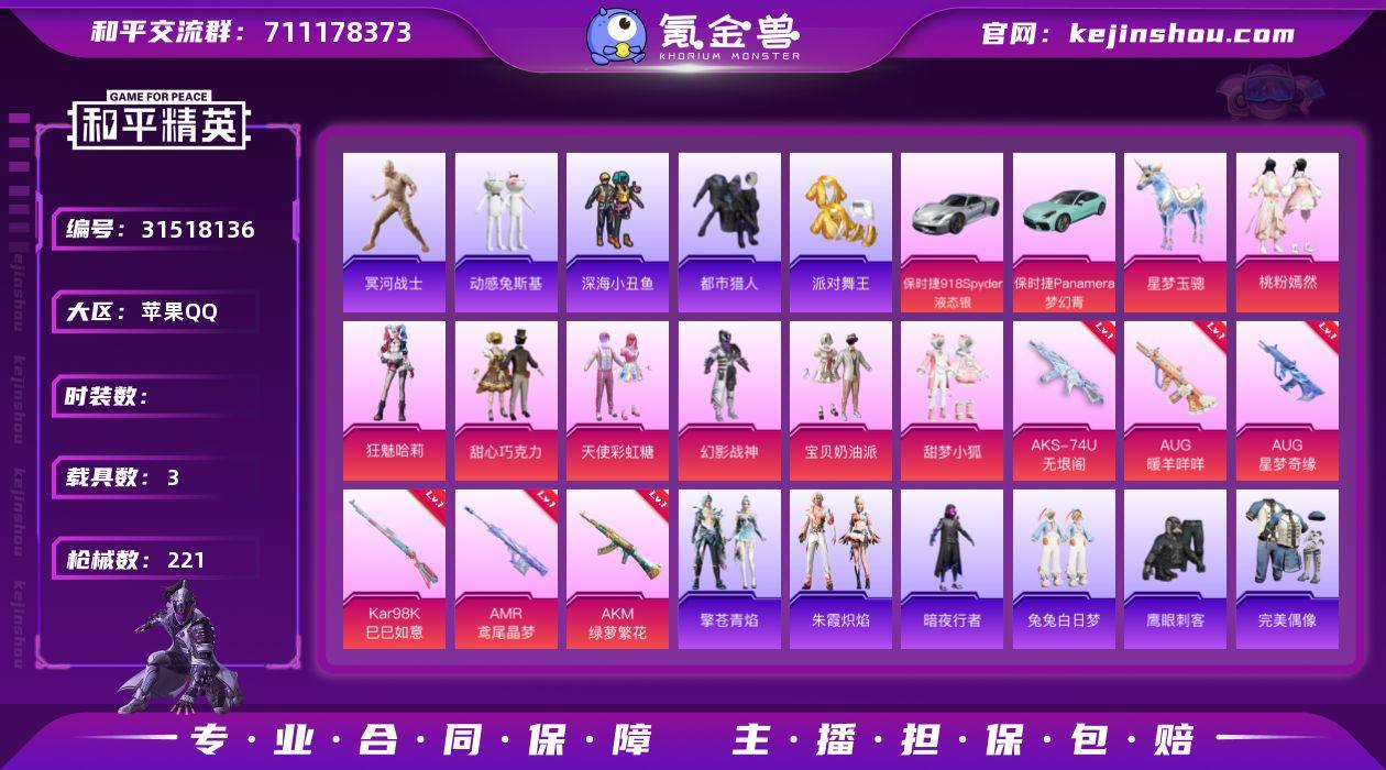 巧克力 小狐 8级AUG星梦 哥特 满地铁天赋】【连体王者268皮1水1无双】c25232-【无二次协助处理】【因赛季更新游戏段付以上号为准!】 苹果Q-5稀有3载具8粉装9特效枪19热门178套装221枪皮 9印记 历史传奇王牌20星 【5稀有】 木乃伊 都市猎人 浪漫天命 派对舞王 派对舞王(金靴子) 【3载具】 保时捷918Spyder(液态银) 保时捷Panamera(梦幻青) 星梦玉骢 【8粉装】 狂魅哈莉 宝贝奶油派 天使彩虹糖 甜心巧克力 桃粉嫣然 幻影战神 甜梦小狐 罪夜之冕 【9特效枪】 AKS-74U-森灵之息 (5级) AKS-74U-无垠阁 (3级) AKM-绿萝繁花 (5级) Kar98K-巳巳如意 (5级) DP-28-豹影疾电 (5级) AUG-暖羊咩咩 (5级) AUG-星梦奇缘 (8级) AMR-鸢尾晶梦 (4级) 燃烧瓶-薄荷可可(3级) 【19热门】 龟仙人 雪山精英 动感兔斯基 晶辉守护 鹰眼刺客 兔兔白日梦 暗夜行者 深海小丑鱼 NV战队服 暗影哥特 团圆交子 瑞龙福将 水银刺客 漫步者 破蛋小黄鸡 极速红龙 AKM-奇异狩猎者 M762-瑞龙福将 S686-奇异狩猎者 【1飞行器】 闪光银龙飞行器 【1头盔】 甜心宝贝头盔 【3背包】 甜心宝贝背包 缤纷油彩背包 神秘黑猫背包