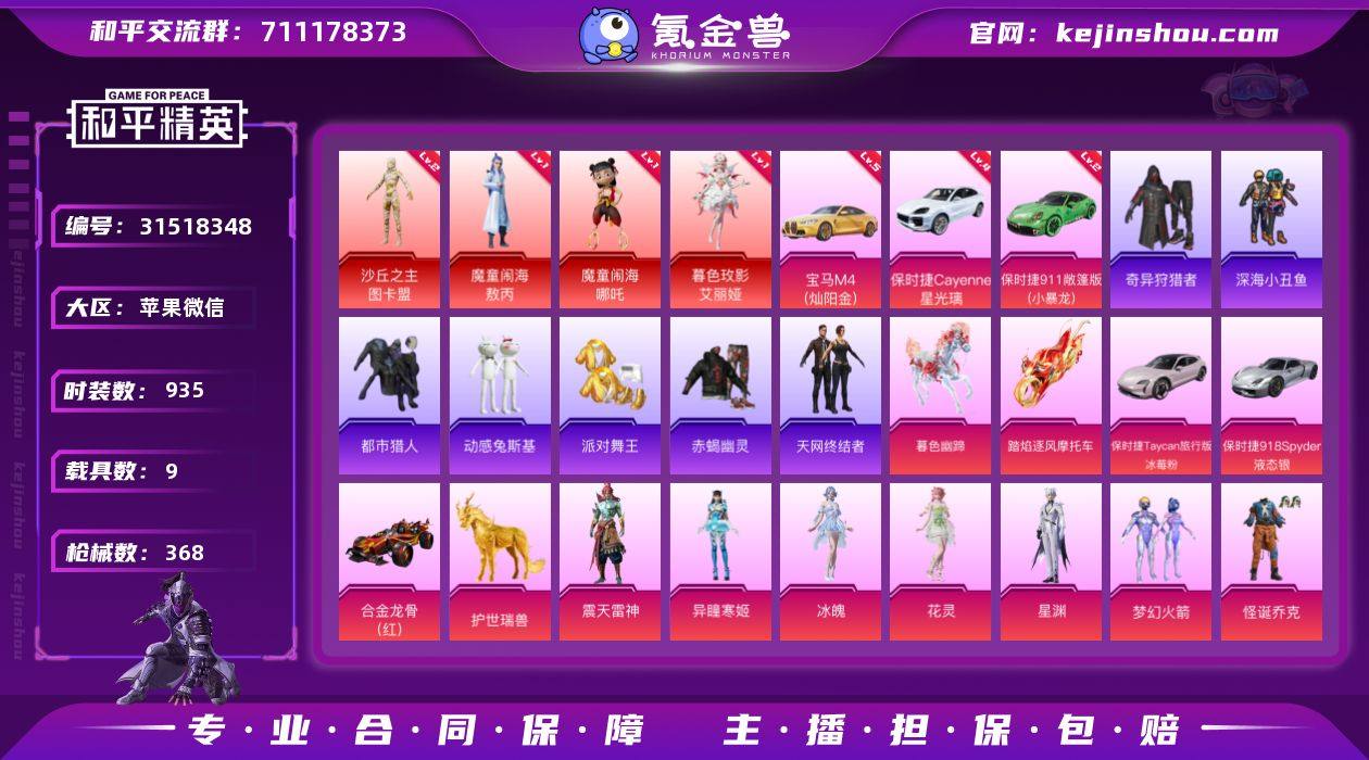【165439热力值】【19王牌】【4绝世】【37粉装28特效枪9载具4红装】19轿跑专属车辆升级组件 【热门】一级暮色玫影-艾丽娅,一级魔童闹海-哪吒,一级魔童闹海-敖丙,二级沙丘之主-图卡盟,赤蝎幽灵,派对舞王,都市猎人,暗影哥特,小丑红鼻头,天网终结者,Mark.06,狂沙舞者,奇异狩猎者,雪山精英,浪漫天命,TT战队服 【载具】四级保时捷Cayenne(星光璃),二级保时捷911 敞篷版(小暴龙),五级宝马M4(灿阳金),保时捷918 Spyder(液态银),保时捷Taycan 旅行版(冰莓粉),护世瑞兽,合金龙骨(红) 【粉装】梦幻火箭,甜心巧克力,天使彩虹糖,宝贝奶油派,第五大道,放客神游,怪诞乔克,震天雷神,异瞳寒姬,花灵,冰魄,星渊,金丰海韵,霁雪冰心,复仇流浪者,海渊国主,骨龙祭渊,银龙傲海,岚岚物语,海盐物语,碧影闪光,天之羽翼,黄伞悠悠,山涧鹿灵,彩虹鹿灵,林间仙鹿,铁血龙王,蜜桃特工,飓风飞鹰,琉璃脉冲,冰霜白皇,炙焰红王,宝贝奶油派,千金淑猫,樱桃泡泡,幻彩电音,狂魅哈莉,冷漠罗丽 【特效枪】三级AKM-暮色玫影,三级P90-魔童闹海 敖丙,四级ARX-无垠阁,五级AKS-74U-无垠阁,九级M416-至情至圣,五级Famas-天象三御,一级Vector-绯穹魔姬,七级Vector-红伞翩翩,七级AUG-星梦奇缘,六级UMP45-相思残雪,五级MG-36-幻彩电音,五级AUG-暖羊咩咩,五级Kar98K-巳巳如意,五级GROZA-镜光银凌,五级汤姆逊-荒漠赏金,五级S12K-海渊国主,五级Kar98K-伏魔团,四级汤姆逊-热量炸弹,四级P90-冷漠罗丽,四级DP-28-千金淑猫,四级SCAR-L-青春物语,四级AWM-焰龙焚天,三级MG3-辉羽雀灵,一级MG3-酷泡奶龙,一级M416-心之恋语,五级DP-28-豹影疾电 【背包】萌熊伴侣背包(3级),萌熊伴侣背包(2级),萌熊伴侣背包(1级),恐龙拽拽背包(2级),恐龙拽拽背包(1级),金蛇镇世背包(1级),金蛇镇世背包(2级) 【头盔】童趣迷兔头盔(1级),童趣迷兔头盔(2级),童趣迷兔头盔(3级) 【优质战备】绯穹...