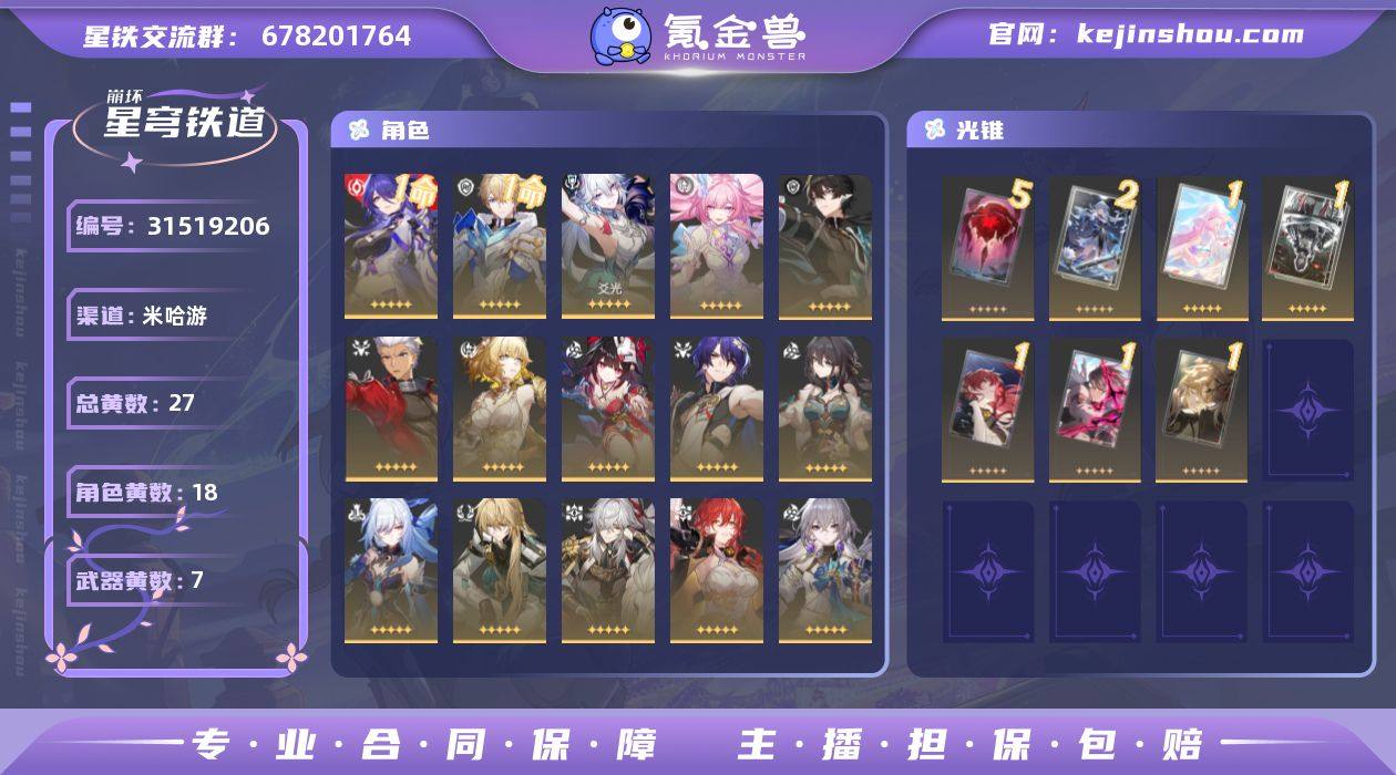 总黄数:27 五星光锥数:7 五星角色数:18 开拓等级:70 开拓者性别:女 星轨专票:0 梦华数量:0 星琼数量:23 1命黄泉,1命杰帕德,0命爻光,0命昔涟,0命丹恒·腾荒,0命Archer,0命阿格莱雅,0命花火,0命真理医生,0命阮·梅,0命镜流,0命罗刹,0命景元,0命姬子,0命布洛妮娅,0命克拉拉,0命白露,0命彦卿 5精记一位星神的陨落,2精此身为剑,1精爱如此刻永恒,1精行于流逝的岸,1精银河铁道之夜,1精以世界之名,1精如泥酣眠 换绑材料:可提供换绑材料 邮箱状态:送网易邮箱 psn绑定情况:否 taptap绑定情况:否 邮箱实名情况:邮箱已实名 卖家说:武器快出了