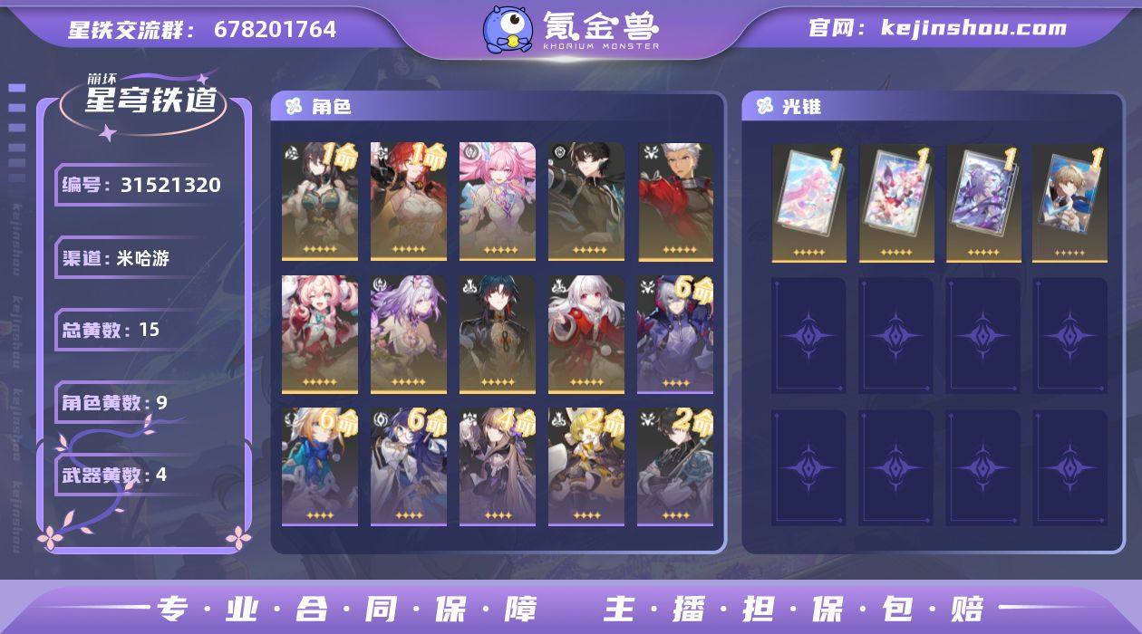 总黄数:15 五星光锥数:4 五星角色数:9 开拓等级:61 开拓者性别:女 星轨专票:0 梦华数量:0 星琼数量:33 1命阮·梅,1命姬子,0命昔涟,0命丹恒·腾荒,0命Archer,0命风堇,0命遐蝶,0命刃,0命克拉拉 1精爱如此刻永恒,1精愿虹光永驻天空,1精让告别,更美一些,1精制胜的瞬间 换绑材料:可提供换绑材料 邮箱状态:送其他邮箱 psn绑定情况:否 taptap绑定情况:否 邮箱实名情况:邮箱已实名 卖家说:退游好久了,上线可以领20抽再加一个五星自选