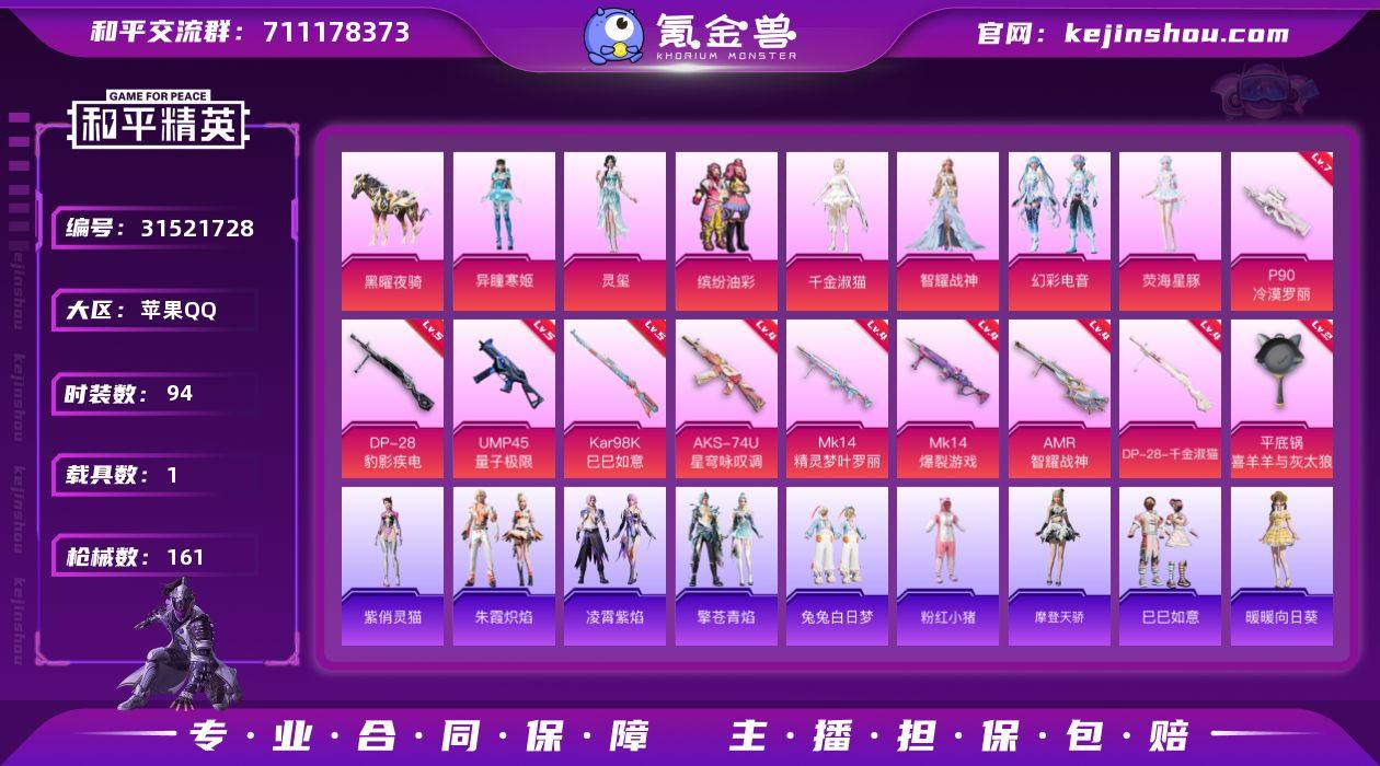 【公主妹妹号·猪妹·千金淑猫·荧海星豚·10特效枪·黑曜夜骑】苹果 手Q-7粉装-10特效枪-1载具-2粉色飞行器-49686热力值-7王牌印记-94套装-161枪皮 【热门品类】:粉装-缤纷油彩,套装-粉红小猪 【粉色套装】:粉装-缤纷油彩,角色-千金淑猫,角色-智耀战神,粉装-幻彩电音,角色-荧海星豚,角色-灵玺,角色-异瞳寒姬 【粉色枪皮等级】:UMP45-量子极限(五级),AKS-74U-星穹咏叹调(四级),P90-冷漠罗丽(七级),Kar98K-巳巳如意(五级),Mk14-精灵梦叶罗丽(四级),Mk14-爆裂游戏(四级),AMR-智耀战神(四级),DP-28-千金淑猫(四级),DP-28-豹影疾电(五级),平底锅-喜羊羊与灰太狼(二级) 【粉色载具】:黑曜夜骑 【粉色枪皮】:UMP45-量子极限,AKS-74U-星穹咏叹调,P90-冷漠罗丽,Kar98K-巳巳如意,Mk14-精灵梦叶罗丽,Mk14-爆裂游戏,AMR-智耀战神,DP-28-千金淑猫,DP-28-豹影疾电,平底锅-喜羊羊与灰太狼 【粉色飞行器】:炫彩糖果飞行器,灵猫魔法师飞行器 【粉色降落伞】:甜心宝贝降落伞,精灵梦叶罗丽降落伞,魔法神域降落伞,金丰海韵降落伞,英伦信使降落伞,千金淑猫降落伞,临安公主降落伞,智耀战神降落伞,幻海仙踪降落伞,星穹咏叹调降落伞,辉羽雀灵降落伞,幻彩电音降落伞,冷漠罗丽降落伞,荧海星豚降落伞,灵猫魔法师降落伞,异瞳寒姬降落伞,炫彩糖果降落伞 【稀有套装】:套装-摩登天骄,套装-巳巳如意,套装-暖暖向日葵,套装-炫彩糖果,套装-雏菊兔兔,套装-萝兰蝴蝶,套装-小熊娃娃,套装-糖糖葫芦,套装-青团波波,套装-棉花软糖,角色-都市丽猫,角色-摩登魅猫,角色-临安公主,套装-燕燕于飞,套装-鱼渊荷华,套装-晶辉守护,套装-粉恋花,套装-紫幽梦,套装-蓝冰羽,套装-果冻柠檬,角色-幽澜祭司,角色-鲛海歌灵,套装-星影赞美诗,套装-星渊小夜曲,套装-霓虹热舞,套装-彩虹兔,套装-云朵...