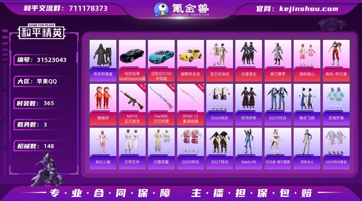 玛莎拉蒂Quattroporte(夜幕蓝)!M416-五爪金龙[7级]!迈凯伦570S(天际蓝) !可二次!D10636.IOSQQ.6粉3枪3车.营地id:747021828. 【热力值】50279【稀有资产】角色-Mark.06/套装-奇异狩猎者/套装-粉红小猪 【粉色套装】套装-宝贝奶油派/套装-古堡领主/套装-银刃赛罗/套装-飒粉甜心/角色-阿尔茜/玩偶服-猪猪侠 【粉色枪皮】M416-五爪金龙[7级]/Kar98K-巳巳如意[4级]/SPAS-12-蜜语绒猫[2级] 【载具】越野奶龙龙/玛莎拉蒂Quattroporte(夜幕蓝)/迈凯伦570S(天际蓝) 【飞行器】机甲封神飞行器 【珍稀背包】洛神天依背包(2级)
